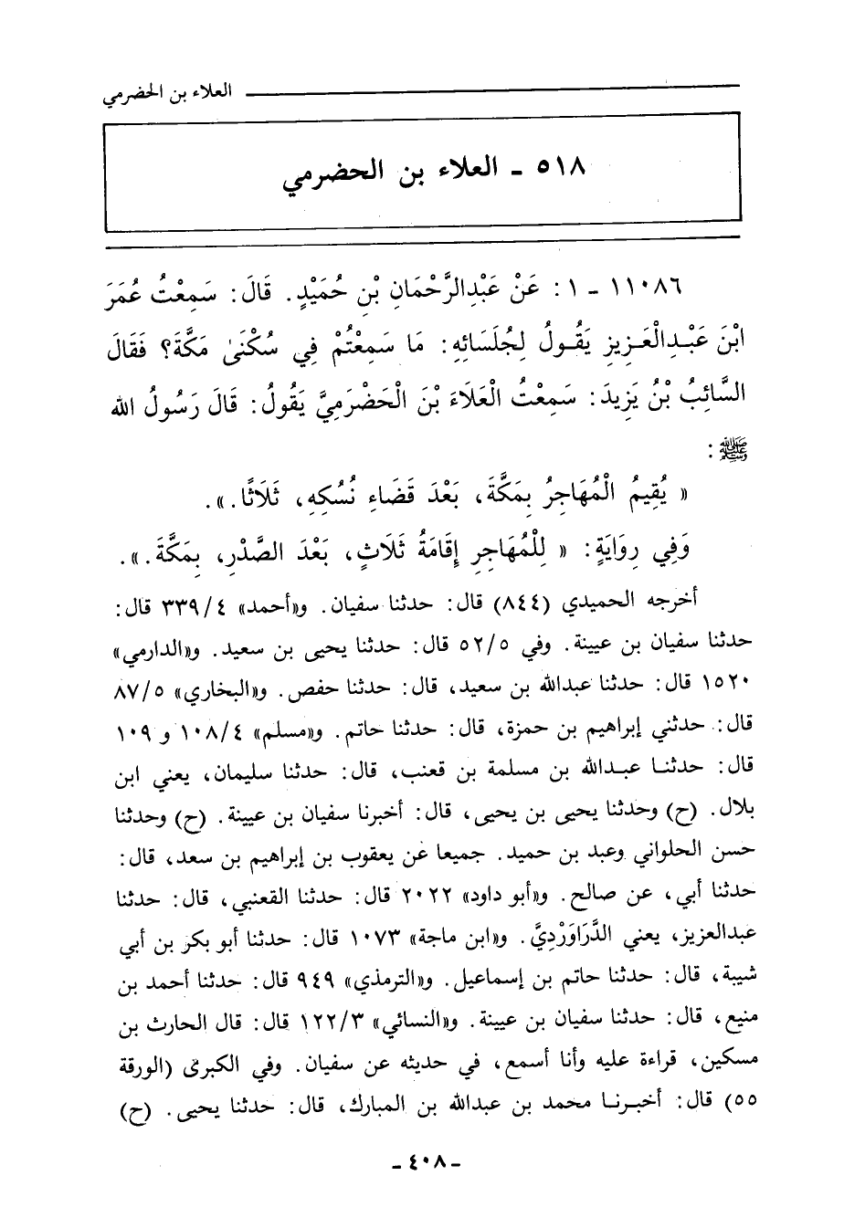 - وفي رواية: عَنْ عَبْدِ الرَّحْمَانِ بْنِ حُمَيْدٍ، قَالَ: سَمِعْتُ عُمَرَ بْنَ عَبْدِ الْعَزِيزِ يَقُولُ لِجُلَسَائِهِ: مَا سَمِعْتُمْ فِي سُكْنَى مَكَّةَ؟ فَقَالَ: السَّائِبُ بْنُ يَزِيدَ: سَمِعْتُ الْعَلَاءَ، أَوْ قَالَ الْعَلَاءَ بْنَ الْحَضْرَمِىِّ: قَالَ رَسُولُ اللهِ صلى الله عليه وسلم: