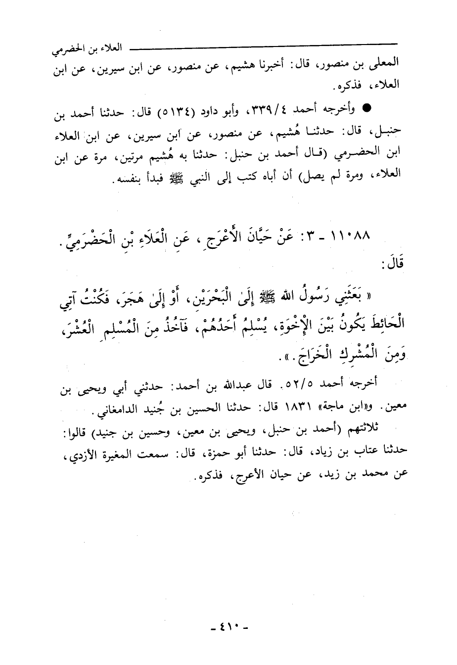 - أخرجه أحمد ٤/ ٣٣٩ (١٩١٩٥) قال: حدَّثنا هُشَيْم، حدَّثنا مَنْصُور، عن ابن سِيرِين، عن ابن العَلَاء بن الحَضْرَمِي (حدَّثنا به هُشَيْم مَرَّتين، مَرَّة عن ابن العَلَاء، ومَرَّة لم يَصِلْ) أَنَّ أَبَاهُ كَتَبَ إِلَى النَّبِيِّ صلى الله عليه وسلم، فَبَدَأَ بِنَفْسِهِ.