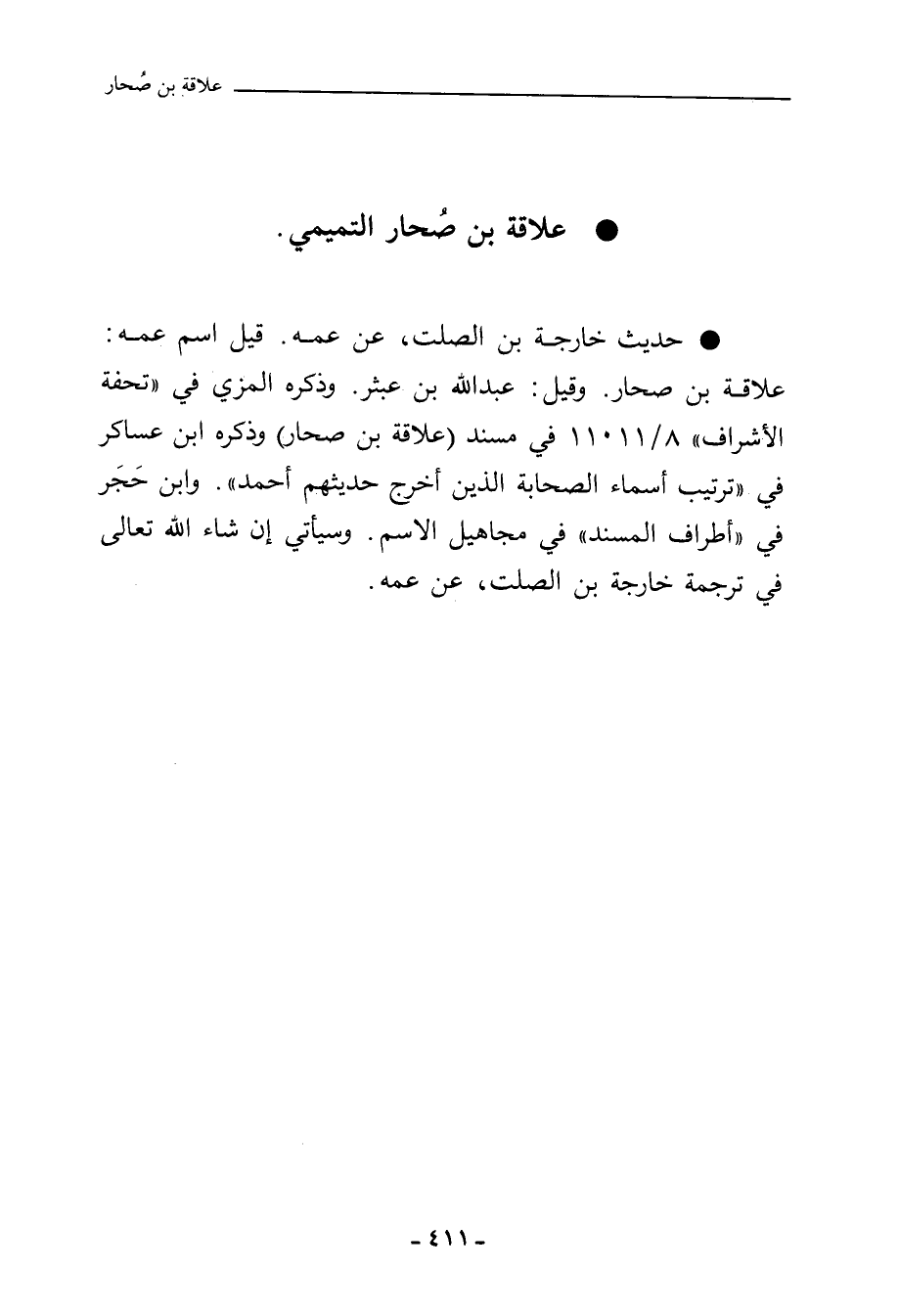 - حديث خارجة بن الصَّلْت، عن عَمِّه، رضي الله تعالى عنه، قيل اسم عَمِّه: عِلَاقَة ابن صُحَار، وقيل: عَبْد الله بن عَبْثَر، وذكره المِزِّي في) تحفة الأشراف (٨/ (١١٠١١) في مسند عِلَاقَة بن صُحَار، وذكره ابن عساكر في) ترتيب أسماءالصَّحابة الذين أخرج حديثهم أحمد، وابن حَجَر في) أطراف المسند (في مجاهيل الاسم، وسيأتي، إن شاء الله تعالى، في ترجمة خارجة بن الصَّلْت، عن عَمِّه.
