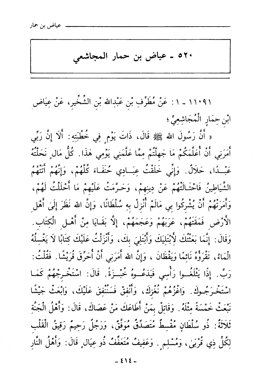 ١١٠٩١ - عَنْ مُطَرِّفِ بْنِ عَبْدِ اللهِ بْنِ الشِّخِّيرِ، عَنْ عِيَاضِ بْنِ حِمَارٍ الْمُجَاشِعِيِّ؛