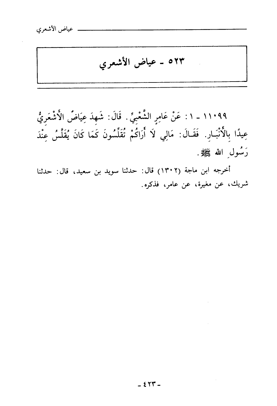 ١١٠٩٩ - عَنْ عَامِرٍ الشَّعْبِيِّ، قَالَ: شَهِدَ عِيَاضٌ الأَشْعَرِيُّ عِيدًا بِالأَنْبَارِ، فَقَالَ: مَالِي لَا أَرَاكُمْ تُقَلِّسُونَ كَمَا كَانَ يُقَلَّسُ عِنْدَ رَسُولِ اللهِ صلى الله عليه وسلم.