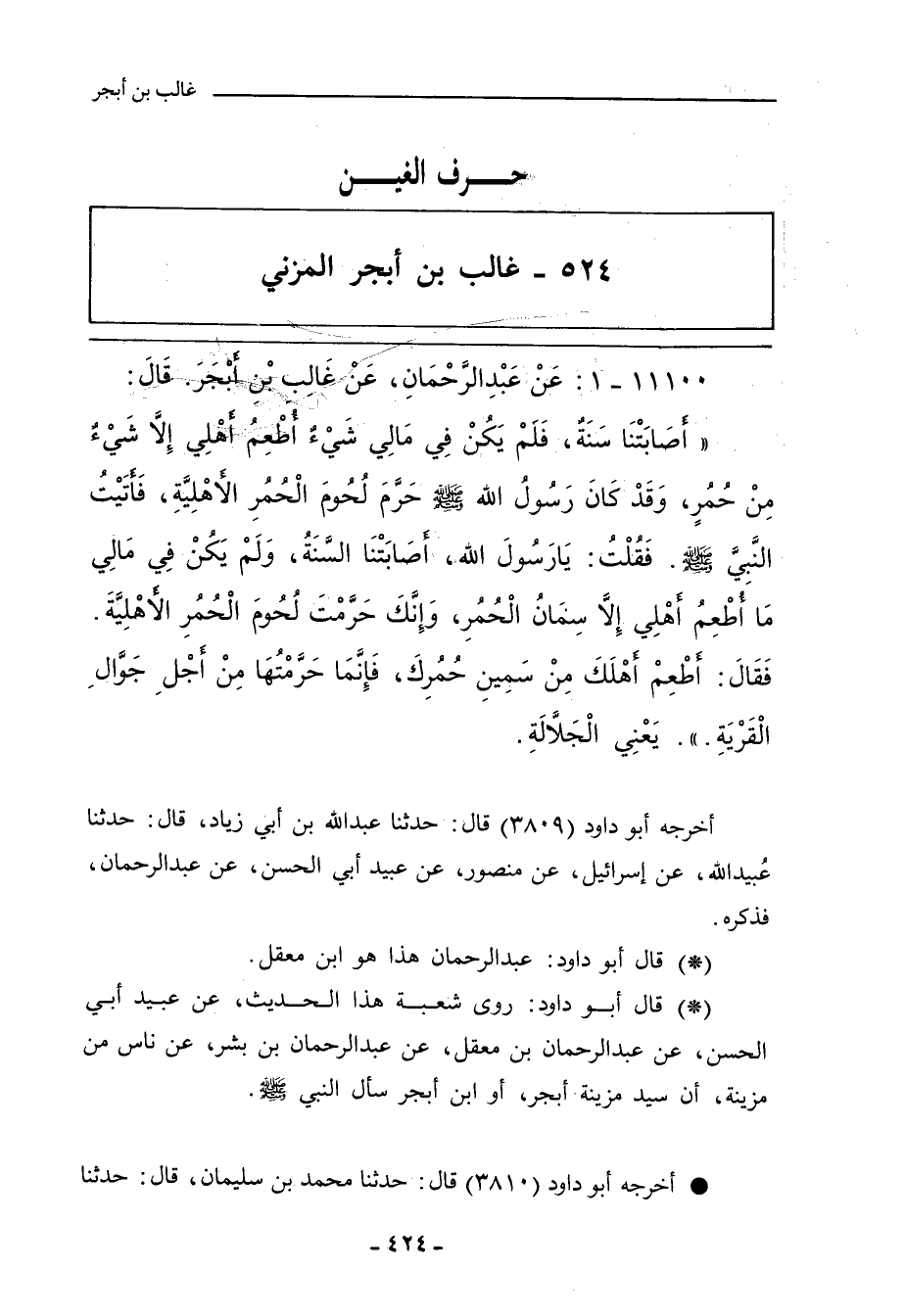 - قال أبو داود، روى شُعْبة هذا الحديثَ عن عُبَيد أَبي الحَسَن، عن عَبْد الرَّحْمان بن مَعْقِل، عن عَبْد الرَّحْمان بن بِشْر، عن ناسٍ مِنْ مُزَينة، أنَّ سَيِّدَ مُزَيْنة أَبْجَرَ، أو ابنَ أَبْجَرَ، سَأَلَ النَّبِيَّ صلى الله عليه وسلم.