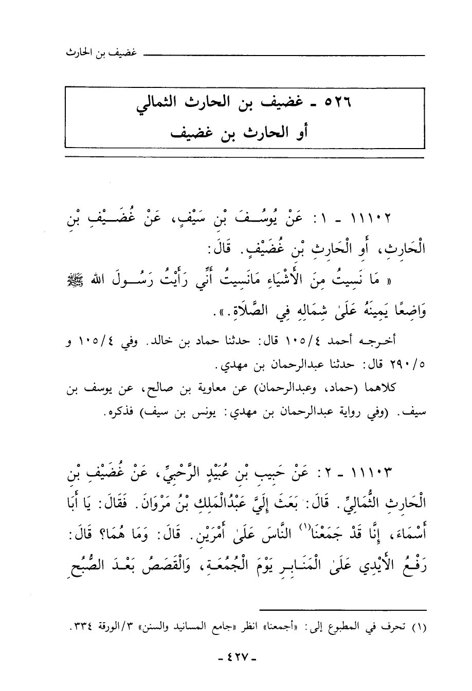 ١١١٠٢ - عَنْ يُونُسَ بْنِ سَيْفٍ، عَنِ الْحَارِثِ بْنِ غُضَيْفٍ، أَوْ غُضَيْفِ بْنِ الْحَارِثِ، قَالَ: