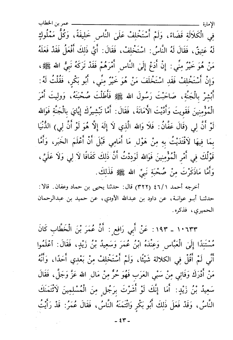 فِي الْكَلَالَةِ قَضَاءً، وَلَمْ أَسْتَخْلِفْ عَلَى النَّاسِ خَلِيفَةً، وَكُلُّ مَمْلُوكٍ لَهُ عَتِيقٌ، فَقَالَ لَهُ النَّاسُ: اسْتَخْلِفْ، فَقَالَ: أَيَّ ذَلِكَ أَفْعَلُ، فَقَدْ فَعَلَهُ مَنْ هُوَ خَيْرٌ مِنِّي: إِنْ أَدَعْ إِلَى النَّاسِ أَمْرَهُمْ، فَقَدْ تَرَكَهُ نَبِيُّ اللهِ، عَلَيْهِ الصَّلَاةُ وَالسَّلَامُ، وَإِنْ أَسْتَخْلِفْ، فَقَدِ اسْتَخْلَفَ مَنْ هُوَ خَيْرٌ مِنِّي أَبُو بَكْرٍ، فَقُلْتُ لَهُ: أَبْشِرْ بِالْجَنَّةِ، صَاحَبْتَ رَسُولَ اللهِ صلى الله عليه وسلم فَأَطَلْتَ صُحْبَتَهُ، ولِّيتَ أَمْرَ الْمُؤْمِنِينَ، فَقَوِيتَ وَأَدَّيْتَ الأَمَانَةَ، فَقَالَ: أَمَّا تَبْشِيرُكَ إِيَّايَ بِالْجَنَّةِ، فَوَاللهِ، لَوْ أَنَّ لِي - قَالَ عَفَّانُ: فَلَا وَاللهِ الَّذِي لَا إِلَهَ إِلَاّ هُوَ لَوْ أَنَّ لِي - الدُّنْيَا بِمَا فِيهَا، لَافْتَدَيْتُ بِهِ مِنْ هَوْلِ مَا أَمَامِي قَبْلَ أَنْ أَعْلَمَ الْخَبَرَ، وَأَمَّا قَوْلُكَ فِي أَمْرِ الْمُؤْمِنِينَ، فَوَاللهِ، لَوَدِدْتُ أَنَّ ذَلِكَ كَفَافًا، لَا لِي وَلَا عَلَيَّ، وَأَمَّا مَا ذَكَرْتَ مَنْ صُحْبَةِ نَبِيِّ اللهِ صلى الله عليه وسلم فَذَلِكَ.