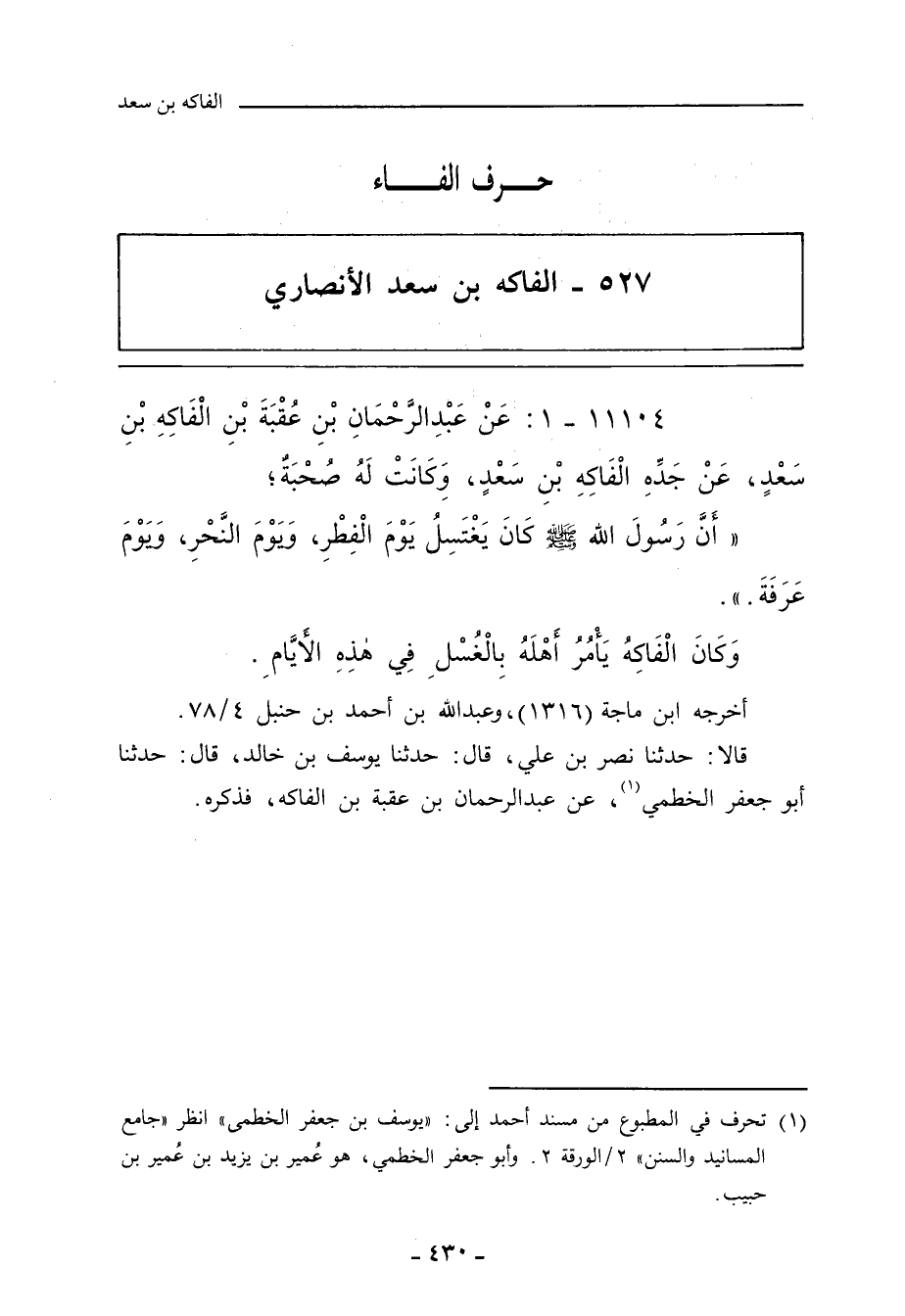 أخرجه ابن ماجة (١٣١٦). وعَبْد الله بن أحمد بن حَنْبل ٤/ ٧٨ (١٦٨٤٠) كلاهما عن نَصْر بن علي الجَهْضَمِي، حدَّثنا يُوسُف بن خالد، حدَّثنا أبو جَعْفَر الخَطْمِي، عن عَبْد الرَّحْمان ابن عُقْبَة بن الفَاكِه، فذكره.