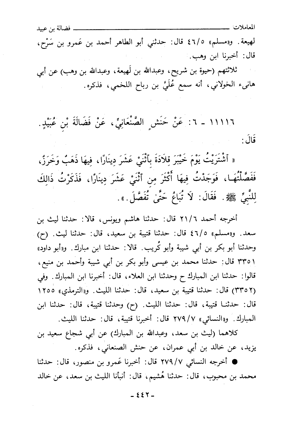 اشْتَرَيْتُ يَوْمَ خَيْبَرَ قِلَادَةً بِاثْنَيْ عَشَرَ دِينَارًا، فِيهَا ذَهَبٌ وَخَرَزٌ، فَفَصَّلْتُهَا، فَوَجَدْتُ فِيهَا أَكْثَرَ مِنِ اثْنَيْ عَشَرَ دِينَارًا، فَذَكَرْتُ ذَلِكَ لِلنَّبِيِّ صلى الله عليه وسلم، فَقَالَ: لَا تُبَاعُ حَتَّى تُفَصَّلَ. م (٤٠٨١) ود (٣٣٥٢) وت