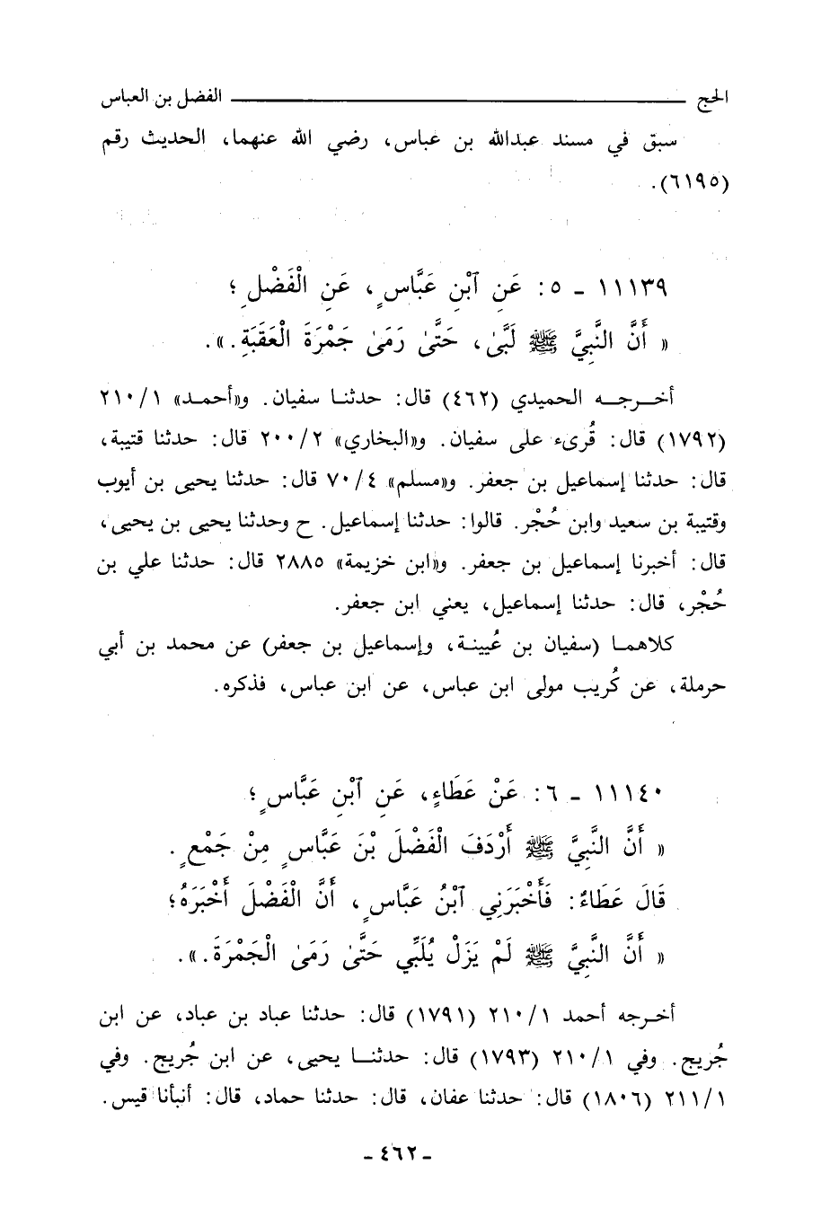 ١١١٣٩ - عَنِ ابْنِ عَبَّاسٍ، عَنِ الْفَضْلِ بْنِ عَبَّاسٍ، وَكَانَ رِدْفَ رَسُولِ اللهِ صلى الله عليه وسلم مِنَ الْمُزْدَلِفَةِ حَتَّى رَمَى الْجَمْرَةَ، قَالَ: