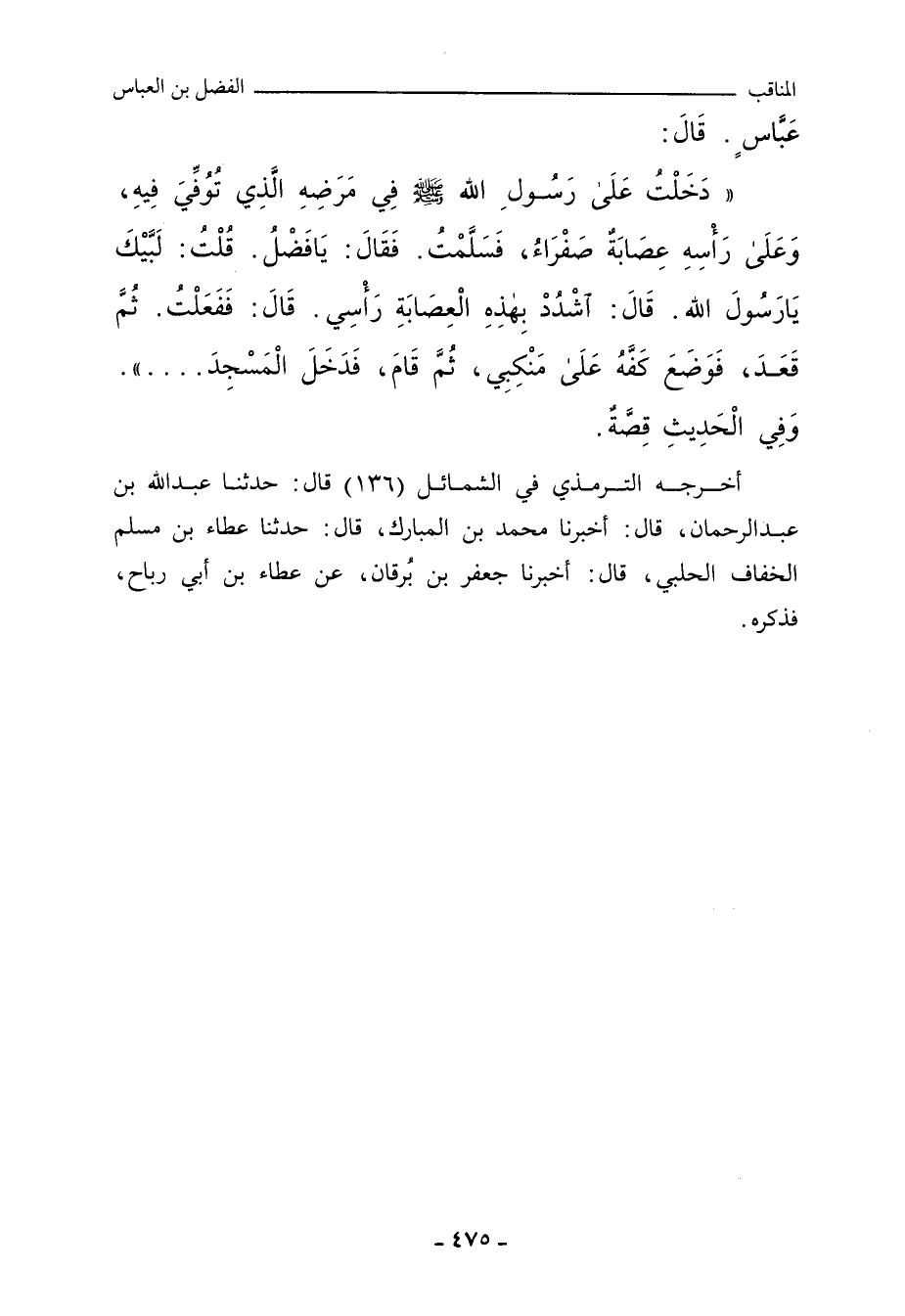 دَخَلْتُ عَلَى النَّبِيِّ صلى الله عليه وسلم فِي مَرَضِهِ، وَعِنْدَ رَأْسِهِ عِصَابَةٌ حَمْرَاءُ، أَوْ قَالَ: صَفْرَاءُ، فَقَالَ: ابْنَ عَمِّي، خُذْ هَذِهِ الْعِصَابَةَ فَاشْدُدْ بِهَا رَأْسِي، فَشَدَدْتُ بِهَا رَأْسَهُ، قَالَ: ثُمَّ تَوَكَّأَ عَلَيَّ حَتَّى دَخَلْنَا الْمَسْجِدَ، فَقَالَ: يَا أَيُّهَا النَّاسُ، إِنَّمَا أَنَا بَشَرٌ مِثْلُكُمْ، وَلَعَلَّهُ أَنْ يَكُونَ قَدْ قَرُبَ مِنِّي خُفُوفٌ مِنْ بَيْنَ أَظْهُرِكُمْ، فَمَنْ كُنْتُ أَصَبْتُ مِنْ عِرْضِهِ، أَوْ مِنْ شَعْرِهِ، أَوْ مِنْ بَشَرِهِ، أَوْ مِنْ مَالِهِ شَيْئًا، هَذَا عِرْضُ مُحَمَّدٍ، وَشَعْرُهُ، وَبَشَرُهُ، وَمَالُهُ، فَلْيَقُمْ فَلْيَقْتَصَّ، وَلَا يَقُولَنَّ أَحَدٌ مِنْكُمْ: إِنِّي أَتَخَوَّفُ مِنْ مُحَمَّدٍ الْعَدَاوَةَ وَالشَّحْنَاءَ، أَلَا وَإِنَّهُمَا لَيْسَا مِنْ طَبِيعَتِي، وَلَيْسَا مِنْ خُلُقِي، قَالَ: ثُمَّ انْصَرَفَ، فَلَمَّا كَانَ مِنَ الْغَدِ أَتَيْتُهُ، فَقَالَ: ابْنَ عَمِّي، لَا أَحْسَبُ أَنَّ مَقَامِي بِالأَمْسِ أَجْزَى عَنِّي، خُذْ هَذِهِ الْعِصَابَةَ فَاشْدُدْ بِهَا رَأْسِي، قَالَ: فَشَدَدْتُ بِهَا رَأْسَهُ، قَالَ: ثُمَّ تَوَكَّأَ عَلَيَّ حَتَّى دَخَلَ الْمَسْجِدَ، فَقَالَ مِثْلَ مَقَالَتِهِ بِالأَمْسِ، ثُمَّ قَالَ: فَإِنَّ أَحَبَّكُمْ إِلَيْنَا مَنِ اقْتَصَّ، قَالَ: فَقَامَ رَجُلٌ، فَقَالَ: يَا رَسُولَ اللهِ، أَرَأَيْتَ يَوْمَ أَتَاكَ السَّائِلُ فَسَأَلَكَ، فَقُلْتَ: مَنْ مَعَهُ شَيْءٌ يُقْرِضُنَا؟ فَأَقْرَضْتُكَ ثَلَاثَةَ دَرَاهِمَ، قَالَ: فَقَالَ: يَا فَضْلُ، أَعْطِهِ، قَالَ: فَأَعْطَيْتُهُ، قَالَ: ثُمَّ قَالَ: وَمَنْ غَلَبَ عَلَيْهِ شَيْءٌ فَلْيَسْأَلْنَا نَدْعُ