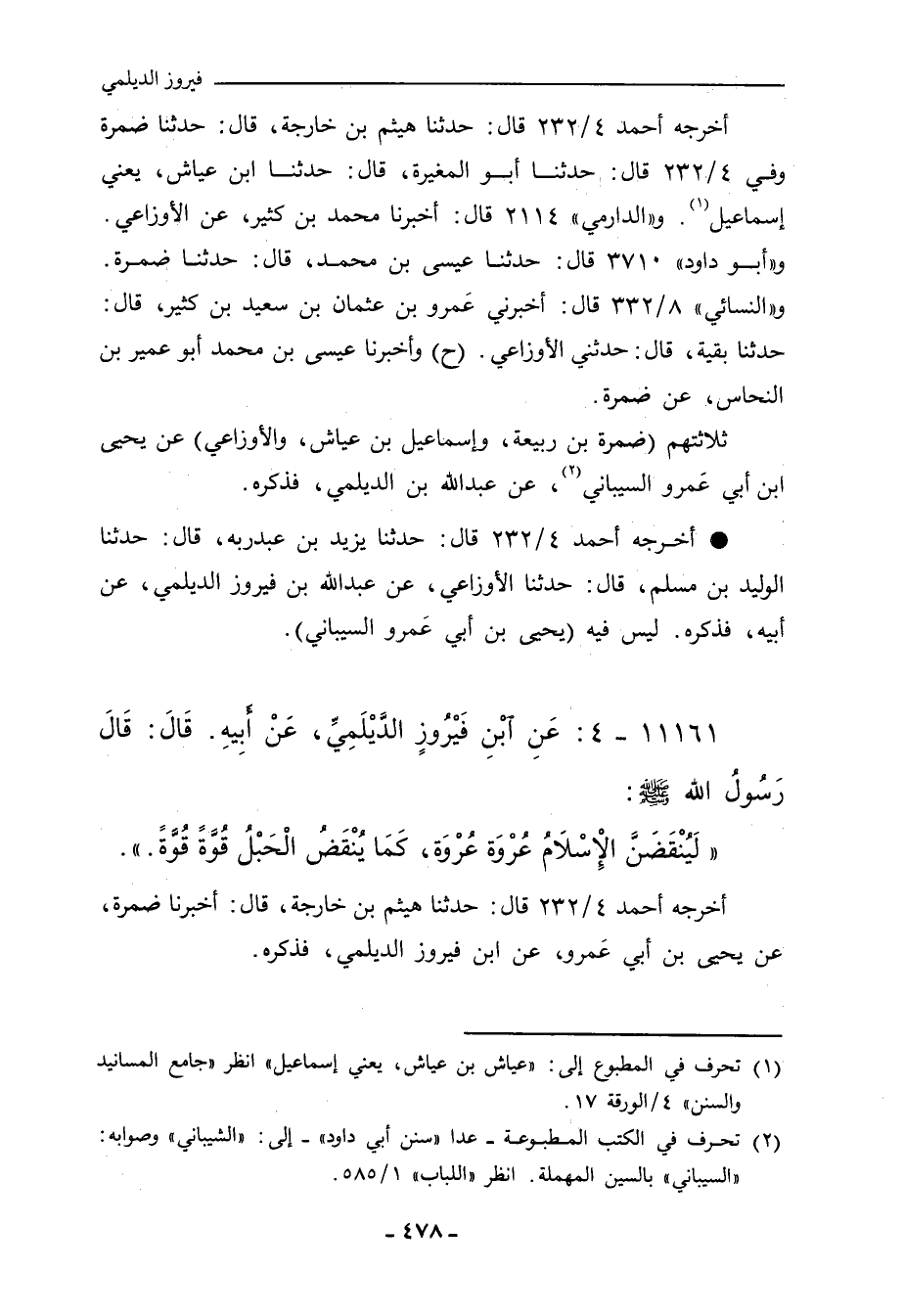 - أخرجه أحمد ١/ ٢٣٢ (١٨٢٠٠) قال: حدَّثنا يَزِيد بن عَبْد ربه، قال: حدَّثنا الوَلِيد بن مُسْلم، قال: حدَّثنا الأَوْزَاعِي، عَنْ عَبْدِ اللهِ بْنِ فَيْرُوزَ الدَّيْلَمِيِّ، عَنْ أَبِيهِ؛