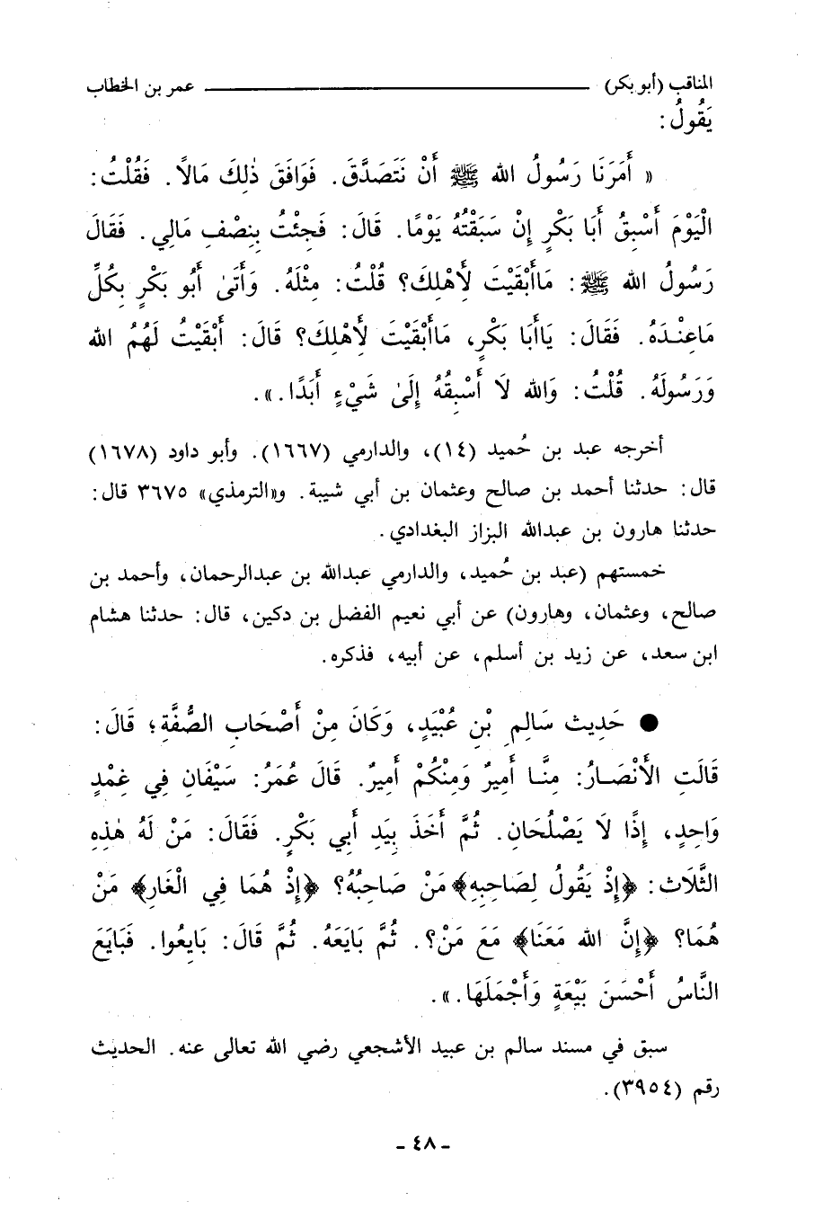 أَمَرَنَا رَسُولُ اللهِ صلى الله عليه وسلم أَنْ نَتَصَدَّقَ، فَوَافَقَ ذَلِكَ عِنْدِي مَالاً، فَقُلْتُ: الْيَوْمَ أَسْبِقُ أَبَا بَكْرٍ إِنْ سَبَقْتُهُ يَوْمًا، قَالَ: فَجِئْتُ بِنِصْفِ مَالِي، فَقَالَ رَسُولُ اللهِ صلى الله عليه وسلم: مَا أَبْقَيْتَ لأَهْلِكَ؟ قُلْتُ: مِثْلَهُ، وَأَتَى أَبُو بَكْرٍ بِكُلِّ مَا عِنْدَهُ، فَقَالَ: يَا أَبَا بَكْرٍ، مَا أَبْقَيْتَ لأَهْلِكَ؟ قَالَ: أَبْقَيْتُ لَهُمُ اللهَ وَرَسُولَهُ، قُلْتُ: وَاللهِ، لَا أَسْبِقُهُ إِلَى شَيْءٍ أَبَدًا. ت