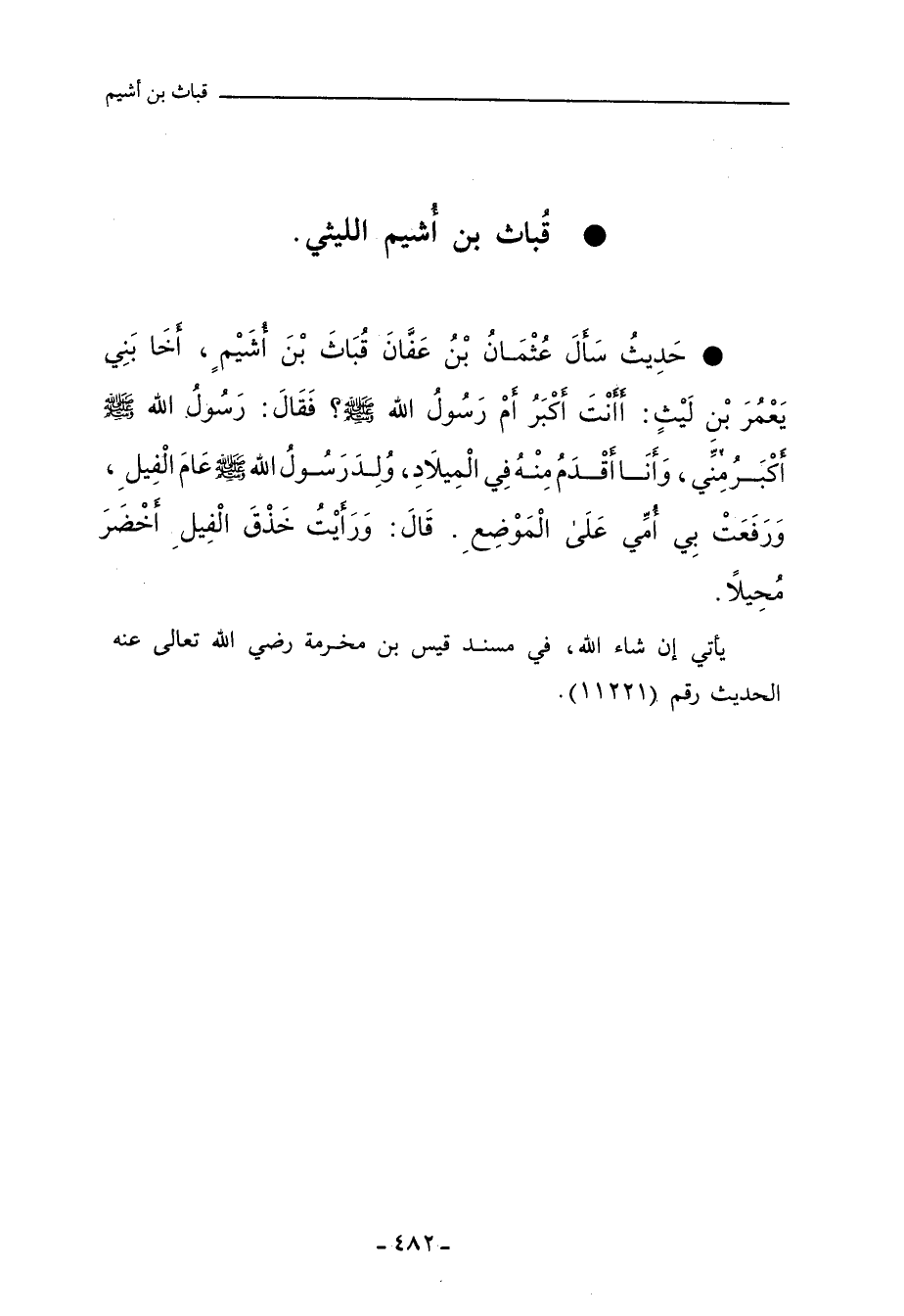 وَسَأَلَ عُثْمَانُ بْنُ عَفَّانَ قُبَاثَ بْنَ أَشْيَمَ، أَخَا بَنِي يَعْمُرَ بْنِ لَيْثٍ: أَأَنْتَ أَكْبَرُ أَمْ رَسُولُ اللهِ صلى الله عليه وسلم؟ فَقَالَ: رَسُولُ اللهِ صلى الله عليه وسلم أَكْبَرُ مِنِّي، وَأَنَا أَقْدَمُ مِنْهُ فِي الْمِيلَادِ، وُلِدَ رَسُولُ اللهِ صلى الله عليه وسلم عَامَ الْفِيلِ، وَرَفَعَتْ بِي أُمِّي عَلَى الْمَوْضِعِ، قَالَ: وَرَأَيْتُ خَذْقَ الْفِيلِ أَخْضَرَ مُحِيلاً.