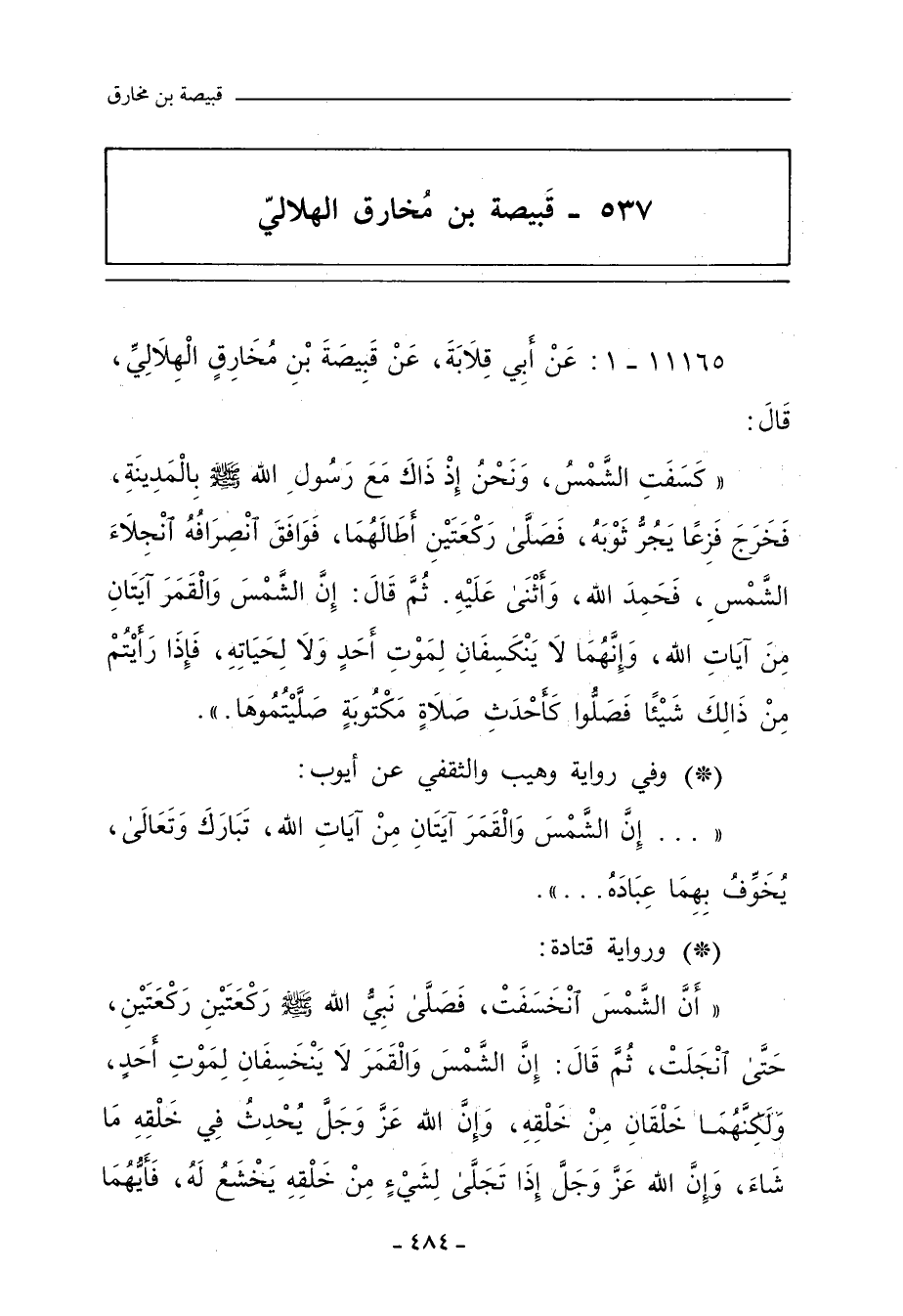 كَسَفَتِ الشَّمْسُ، وَنَحْنُ إِذْ ذَاكَ مَعَ رَسُولِ اللهِ صلى الله عليه وسلم بِالْمَدِينَةِ، فَخَرَجَ فَزِعًا يَجُرُّ ثَوْبَهُ، فَصَلَّى رَكْعَتَيْنِ أَطَالَهُمَا، فَوَافَقَ انْصِرَافُهُ انْجِلَاءَ الشَّمْسِ، فَحَمِدَ اللهَ، وَأَثْنَى عَلَيْهِ، ثُمَّ قَالَ: إِنَّ الشَّمْسَ وَالْقَمَرَ آيَتَانِ مِنْ آيَاتِ اللهِ، وَإِنَّهُمَا لَا يَنْكَسِفَانِ لِمَوْتِ أَحَدٍ وَلَا لِحَيَاتِهِ، فَإِذَا رَأَيْتُمْ مِنْ ذَلِكَ شَيْئًا، فَصَلُّوا كَأَحْدَثِ صَلَاةٍ مَكْتُوبَةٍ صَلَّيْتُمُوهَا. س رواية أَيُّوب