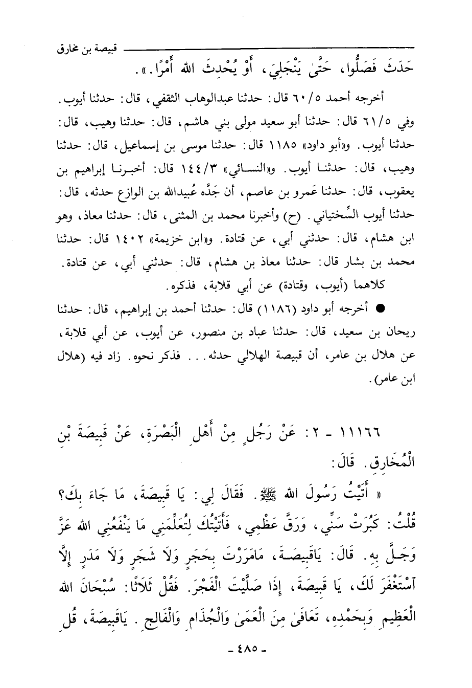 أخرجه أحمد ٥/ ٦٠ (٢٠٨٨٣) قال: حدَّثنا عَبْد الوَهَّاب الثَّقَفِي، حدَّثنا أَيُّوب. وفي ٥/ ٦١ (٢٠٨٨٤) قال: حدَّثنا أبو سَعِيد، مَوْلَى بني هاشم، أَخْبَرنا وُهَيْب، حدَّثنا أَيُّوب. و"أبو داود"١١٨٥ قال: حدَّثنا مُوسَى بن إِسْمَاعِيل، حدَّثنا وُهَيْب، حدَّثنا أَيُّوب. و"النَّسائي"٣/ ١٤٤، وفي "الكبرى"١٨٨٤ قال: أَخْبَرنا إبراهيم بن يَعْقُوب، قال: حدَّثنا عَمْرو بن عاصم، أن جَدَّه عُبَيْد الله ابن الوازع حدَّثه، قال: حدَّثنا أَيُّوب السَّخْتِيَانِي. وفي ٣/ ١٤٤، وفي "الكبرى"١٨٨٥ قال: أَخْبَرنا مُحَمد بن المُثَنَّى، قال: حدَّثنا مُعَاذ، وهو ابن هِشَام، قال: حدَّثني أَبي، عن قَتَادَة. و"ابن خزيمة"١٤٠٢ قال: حدَّثنا مُحَمد بن بَشَّار، حدَّثنا مُعَاذ بن هِشَام، حدَّثني أَبي، عن قَتَادَة.