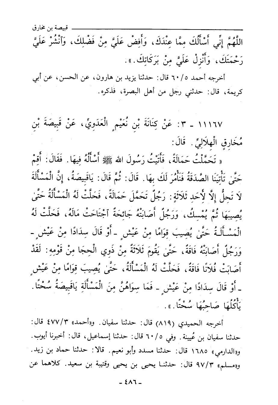 ١١١٦٧ - عَنْ كِنَانَةَ بْنِ نُعَيْمٍ الْعَدَوِيِّ، عَنْ قَبِيصَةَ بْنِ مُخَارِقٍ الْهِلَالِيِّ، قَالَ: