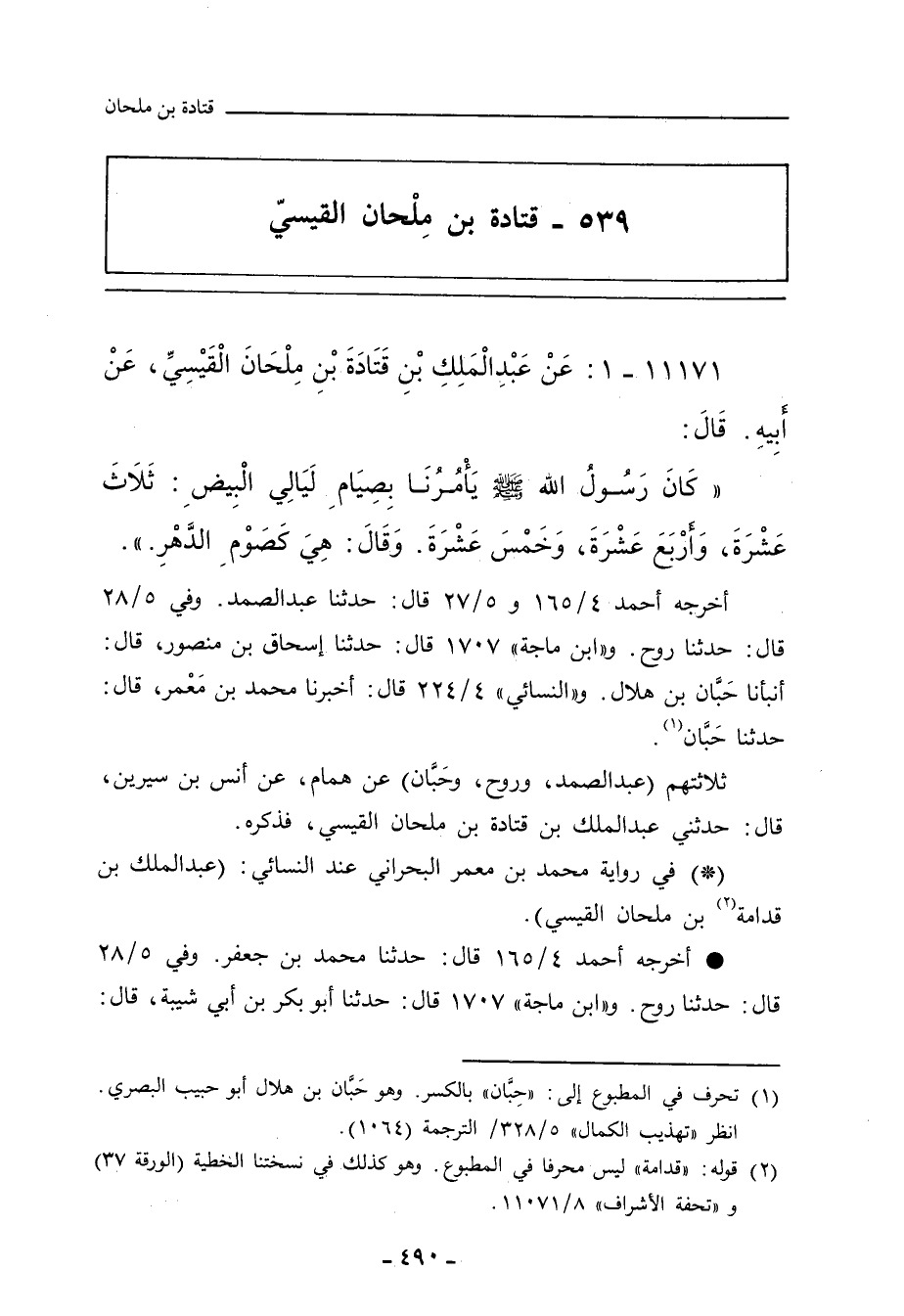 ثلاثتهم (عَبْد الصَّمَد، ورَوْح، وحَبَّان) عن هَمَّام، عن أَنَس بن سِيرِين، حدَّثني عَبْد الملك بن قَتَادَة بن مِلْحَان القَيْسِي، فذكره.