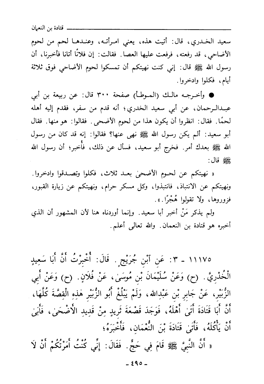 ١١١٧٥ - عَنِ ابْنِ جُرَيْجٍ، قَالَ: أُخْبِرْتُ أَنَّ أَبَا سَعِيدٍ الْخُدْرِيَّ (ح) وَعَنْ سُلَيْمَانَ بْنِ مُوسَى، عَنْ فُلَانٍ (ح) وَعَنْ أَبِي الزُّبَيْرِ، عَنْ جَابِرِ بْنِ عَبْدِ اللهِ، وَلَمْ يَبْلُغْ أَبُو الزُّبَيْرِ هَذِهِ الْقَصَّةَ كُلَّهَا؛ أَنَّ أَبَا قَتَادَةَ أَتَى أَهْلَهُ، فَوَجَدَ قَصْعَةَ ثَرِيدٍ مِنْ قَدِيدِ الأَضْحَى، فَأَبَى أَنْ يَأْكُلَهُ، فَأَتَى قَتَادَةَ بْنَ النُّعْمَانِ فَأَخْبَرَهُ؛