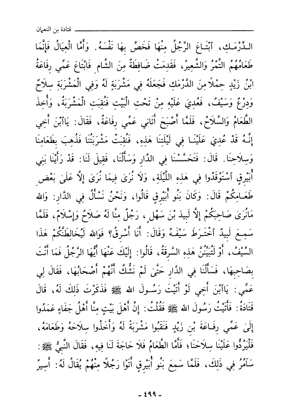 الدَّرْمَكِ، ابْتَاعَ الرَّجُلُ مِنْهَا، فَخَصَّ بِهَا نَفْسَهُ، وَأَمَّا الْعِيَالُ فَإِنَّمَا طَعَامُهُمُ التَّمْرُ وَالشَّعِيرُ، فَقَدِمَتْ ضَافِطَةٌ مِنَ الشَّامِ، فَابْتَاعَ عَمِّي رِفَاعَةُ بْنُ زَيْدٍ حِمْلاً مِنَ الدَّرْمَكِ، فَجَعَلَهُ فِي مَشْرَبَةٍ لَهُ، وَفِي الْمَشْرَبَةِ سِلَاحٌ وَدِرْعٌ وَسَيْفٌ، فَعُدِيَ عَلَيْهِ مِنْ تَحْتِ الْبَيْتِ، فَنُقِبَتِ الْمَشْرَبَةُ، وَأُخِذَ الطَّعَامُ وَالسِّلاحُ، فَلَمَّا أَصْبَحَ أَتَانِي عَمِّي رِفَاعَةُ، فَقَالَ: يَا ابْنَ أَخِي، إِنَّهُ قَدْ عُدِيَ عَلَيْنَا فِي لَيْلَتِنَا هَذِهِ، فَنُقِبَتْ مَشْرَبَتُنَا، فَذُهِبَ بِطَعَامِنَا وَسِلَاحِنَا، قَالَ: فَتَحَسَّسْنَا فِي الدَّارِ وَسَأَلْنَا، فَقِيلَ لَنَا: قَدْ رَأَيْنَا بَنِي أُبَيْرِقٍ