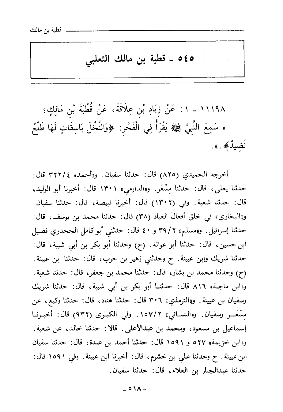١١١٩٨ - عَنْ زِيَادِ بْنِ عِلَاقَةَ، عَنْ قُطْبَةَ بْنِ مَالِكٍ؛