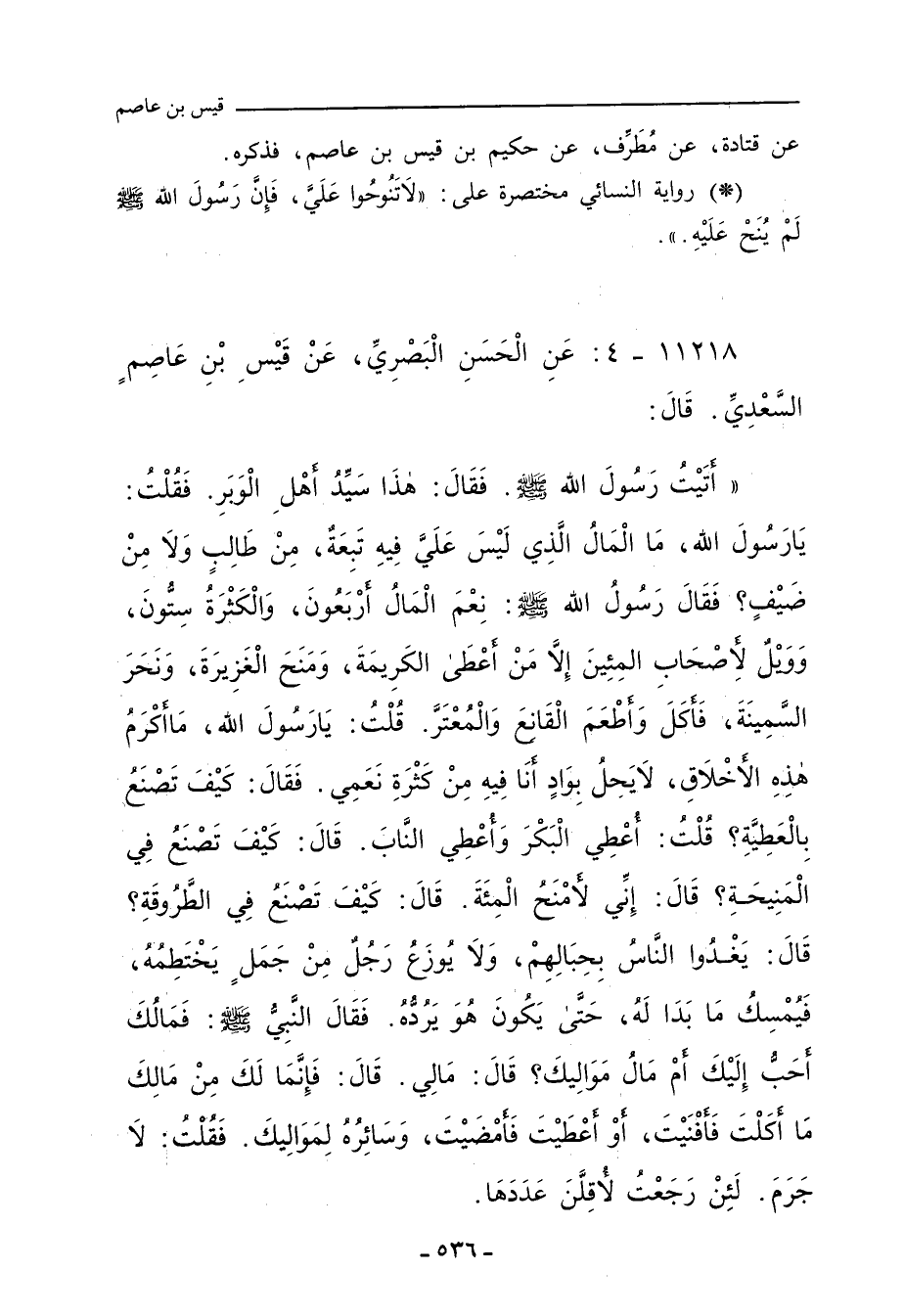 أَتَيْتُ رَسُولَ اللهِ صلى الله عليه وسلم، فَقَالَ: هَذَا سَيِّدُ أَهْلِ الْوَبَرِ، فَقُلْتُ: يَا رَسُولَ اللهِ، مَا الْمَالُ الَّذِي لَيْسَ عَلَيَّ فِيهِ تَبِعَةٌ، مِنْ طَالِبٍ وَلا مِنْ ضَيْفٍ؟ فَقَالَ رَسُولُ اللهِ صلى الله عليه وسلم: نِعْمَ الْمَالُ أَرْبَعُونَ، وَالْكَثْرَةُ سِتُّونَ، وَوَيْلٌ لأَصْحَابِ المِئِينَ، إِلَاّ مَنْ أَعْطَى الْكَرِيمَةَ، وَمَنَحَ الْغَزِيرَةَ، وَنَحَرَ السَّمِينَةَ، فَأَكَلَ وَأَطْعَمَ الْقَانِعَ وَالْمُعْتَرَّ، قُلْتُ: يَا رَسُولَ اللهِ، مَا أَكْرَمُ هَذِهِ الأَخْلَاقِ، لَا يَحِلُ بِوَادٍ أَنَا فِيهِ مِنْ كَثْرَةِ نَعَمِي، فَقَالَ: كَيْفَ تَصْنَعُ بِالْعَطِيَّةِ؟ قُلْتُ: أُعْطِي الْبَكْرَ، وَأُعْطِي النَّابَ، قَالَ: كَيْفَ تَصْنَعُ فِي الْمَنِيحَةِ؟ قَالَ: إِنِّي لأَمْنَحُ الْمِئَةَ، قَالَ: كَيْفَ تَصْنَعُ فِي الطَّرُوقَةِ؟ قَالَ: يَغْدُوا النَّاسُ بِحِبَالِهِمْ، وَلَا يُوزَعُ رَجُلٌ مِنْ جَمَلٍ يَخْتَطِمُهُ، فَيُمْسِكُ مَا بَدَا لَهُ، حَتَّى يَكُونَ هُوَ يَرُدُّهُ، فَقَالَ النَّبِيُّ صلى الله عليه وسلم: فَمَالُكَ أَحَبُّ إِلَيْكَ، أَمْ مَالُ مَوَالِيكَ؟ قَالَ: مَا لِي، قَالَ: فَإِنَّمَا لَكَ مِنْ مَالِكَ مَا أَكَلْتَ فَأَفْنَيْتَ، أَوْ أَعْطَيْتَ فَأَمْضَيْتَ، وَسَائِرُهُ لِمَوَالِيكَ، فَقُلْتُ: لَا جَرَمَ، لَئِنْ رَجَعْتُ لأُقِلَّنَ عَدَدَهَا،