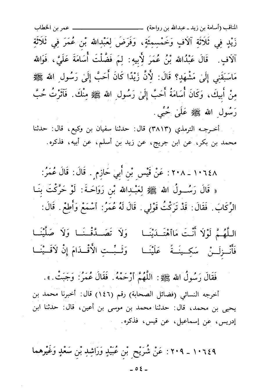 زَيْدٍ فِي ثَلَاثَةِ آلَافٍ وَخَمْسِمِئَةٍ، وَفَرَضَ لِعَبْدِ اللهِ بْنِ عُمَرَ فِي ثَلَاثَةِ آلَافٍ، قَالَ عَبْدُ اللهِ بْنُ عُمَرَ لأَبِيهِ: لِمَ فَضَّلْتَ أُسَامَةَ عَلَيَّ، فَوَاللهِ مَا سَبَقَنِي إِلَى مَشْهَدٍ، قَالَ: لأَنَّ زَيْدًا كَانَ أَحَبَّ إِلَى رَسُولِ اللهِ صلى الله عليه وسلم مِنْ أَبِيكَ، وَكَانَ أُسَامَةُ أَحَبَّ إِلَى رَسُولِ اللهِ مِنْكَ، فَآثَرْتُ حُبَّ رَسُولِ اللهِ صلى الله عليه وسلم عَلَى حُبِّي.