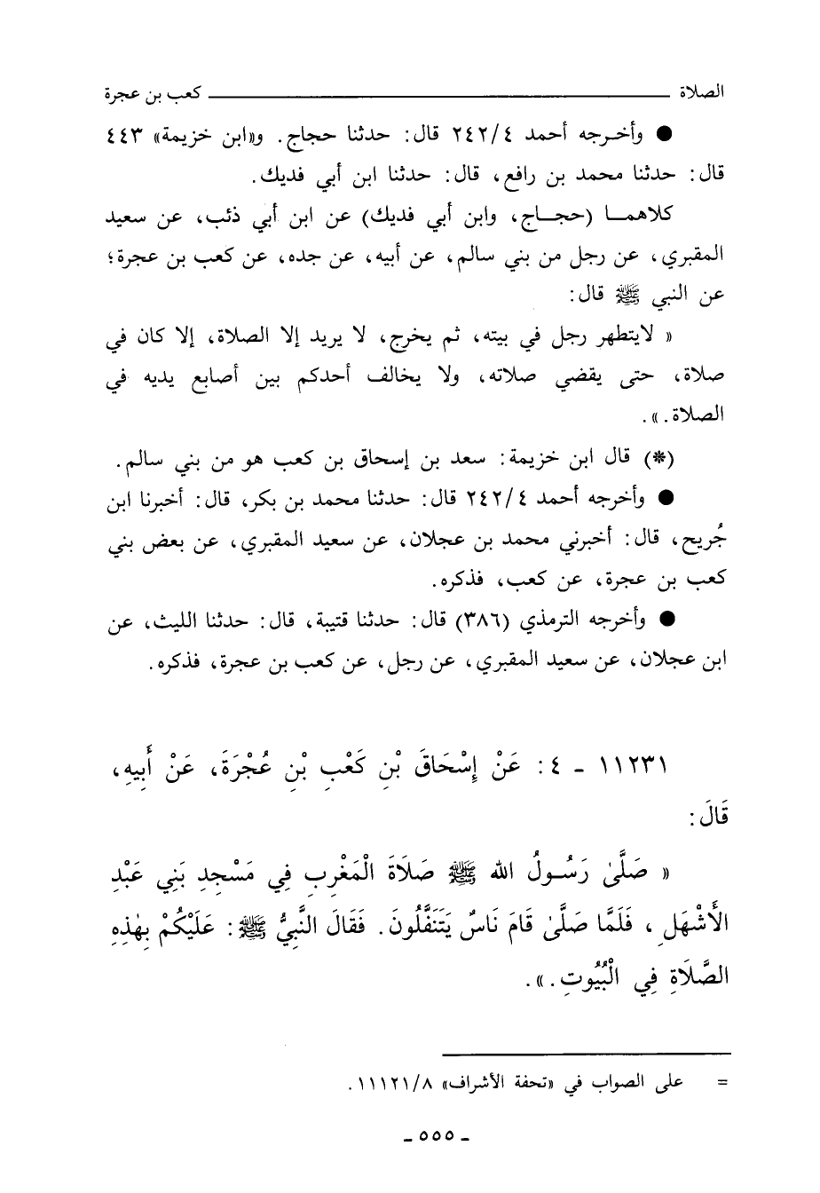١١٢٣١ - عَنْ إِسْحَاقَ بْنِ كَعْبِ بْنِ عُجْرَةَ، عَنْ أَبِيهِ، قَالَ: