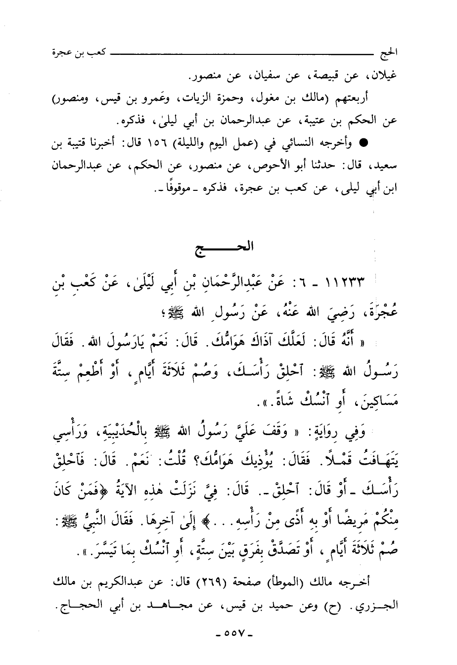 ١١٢٣٣ - عَنْ عَبْدِ الرَّحْمَانِ بْنِ أَبِي لَيْلَى، عَنْ كَعْبِ بْنِ عُجْرَةَ، رَضِيَ اللهُ عَنْهُ، عَنْ رَسُولِ اللهِ صلى الله عليه وسلم، أَنَّهُ قَالَ: