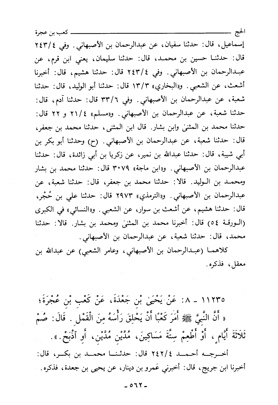 إِسْمَاعِيل، حدَّثنا سُفْيان، عن عَبْد الرَّحْمان بن الأَصْبَهَانِي. وفي ٤/ ٢٤٣ (١٨٣٠٠) قال: حدَّثنا حُسَيْن بن مُحَمد، حدَّثنا سُلَيْمان، يَعْنِي ابن قَرْم، عن عَبْد الرَّحْمان بن الأَصْبَهَانِي. وفي (١٨٣٠٣) قال: حدَّثنا هُشَيْم، أَخْبَرنا أَشْعَث، عن الشَّعْبِي. و"البُخَارِي" ٣/ ١٣ (١٨١٦) قال: حدَّثنا أبو الوَلِيد، حدَّثنا شُعْبة، عن عَبْد الرَّحْمان بن الأَصْبَهَانِي. وفي ٦/ ٣٣ (٤٥١٧) قال: حدَّثنا آدم، حدَّثنا شُعْبة، عن عَبْد الرَّحْمان بن الأَصْبَهَانِي. و"مسلم"٤/ ٢١ (٢٨٥٤) قال: حدَّثنا مُحَمد بن المُثَنَّى، وابن بَشَّار، قال ابن المُثَنَّى: حدَّثنا مُحَمد بن جَعْفَر، حدَّثنا شُعْبة، عن عَبْد الرَّحْمان بن الأَصْبَهَانِي. وفي ٤/ ٢٢ (٢٨٥٥) قال: وحدَّثنا أبو بَكْر بن أَبي شَيْبَة، حدَّثنا عَبْد الله بن نُمَيْر، عن زكريا بن أَبي زائدة، حدَّثنا عَبْد الرَّحْمان بن الأَصْبَهَانِي. و"ابن ماجة"٣٠٧٩ قال: حدَّثنا مُحَمد بن بَشَّار، ومُحَمد بن الوَلِيد، قالا: حدَّثنا مُحَمد بن جَعْفَر، حدَّثنا شُعْبة، عن عَبْد الرَّحْمان بن الأَصْبَهَانِي. و"التِّرمِذي"٢٩٧٣ قال: حدَّثنا علي بن حُجْر، حدَّثنا هُشَيْم، عن أَشْعَث بن سَوَّار، عن الشَّعْبِي. و"النَّسائي" في "الكبرى"٤٠٩٨ قال: أَخْبَرنا مُحَمد بن المُثَنَّى، ومُحَمد بن بَشَّار، قالا: حدَّثنا مُحَمد، قال: حدَّثنا شُعْبة، عن عَبْد الرَّحْمان بن
