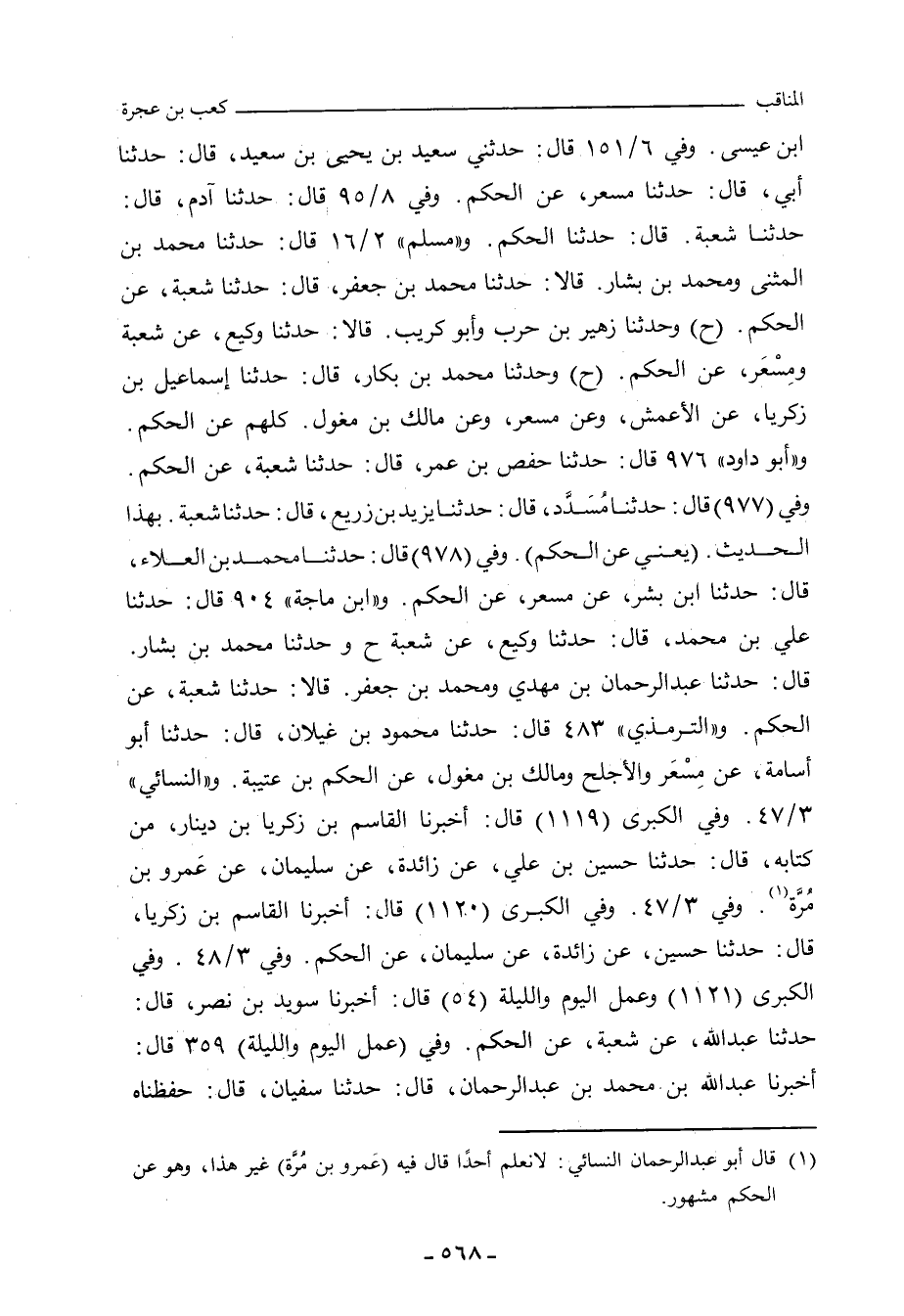 عن الأَعْمَش، وعن مِسْعَر، وعن مالك بن مِغْوَل، كلهم عن الحَكَم. و"أبو داود"٩٧٦ قال: حدَّثنا حَفْص بن عُمَر، حدَّثنا شُعْبة، عن الحَكَم. وفي (٩٧٧) قال: حدَّثنا مُسَدَّد، حدَّثنا يَزِيد بن زُرَيْع، حدَّثنا شُعْبة، بهذا الحديث. وفي (٩٧٨) قال: حدَّثنا مُحَمد بن العَلَاء، حدَّثنا ابن بِشْر، عن مِسْعَر، عن الحَكَم. و"ابن ماجة"٩٠٤ قال: حدَّثنا علي بن مُحَمد، حدَّثنا وَكِيع، حدَّثنا شُعْبة (ح) وحدَّثنا مُحَمد بن بَشَّار، حدَّثنا عَبْد الرَّحْمان بن مَهْدي، ومُحَمد بن جَعْفَر، قالا: حدَّثنا شُعْبة، عن الحَكَم. و"التِّرمِذي"٤٨٣ قال: حدَّثنا محمود بن غَيْلان، حدَّثنا أبو أُسَامة، عن مِسْعَر، والأَجْلَح، ومالك بن مِغْوَل، عن الحَكَم بن عُتَيْبَة. قال محمود: قال أبو أُسَامة: وزادني زائدة، عن الأَعْمَش، عن الحَكَم، عن عَبْد الرَّحْمان بن أَبي لَيْلَى، قال: ونحن نقول: وعلينا معهم. و"النَّسائي"٣/ ٤٧، وفي "الكبرى"١٢١١ قال: أَخْبَرنا القاسم بن زكريا بن دِينَار، من كتابه، قال: حدَّثنا حُسَيْن بن علي، عن زائدة، عن سُلَيْمان، عن عَمْرو بن مُرَّة. وفي ٣/ ٤٧، وفي "الكبرى"١٢١٢ قال: أَخْبَرنا القاسم بن زكريا، قال: حدَّثنا حُسَيْن، عن زائدة، عن سُلَيْمان، عن الحَكَم. وفي ٣/ ٤٨، وفي "الكبرى"١٢١٣، "عمل اليوم والليلة"٥٤ قال: أَخْبَرنا سُوَيْد بن نَصْر، قال: حدَّثنا عَبْد الله، عن شُعْبة، عن الحَكَم "عمل اليوم والليلة"٣٥٩ قال: أَخْبَرنا عَبْد الله بن مُحَمد بن عَبْد الرَّحْمان، قال: حدَّثنا سُفْيان، قال: حفظناه