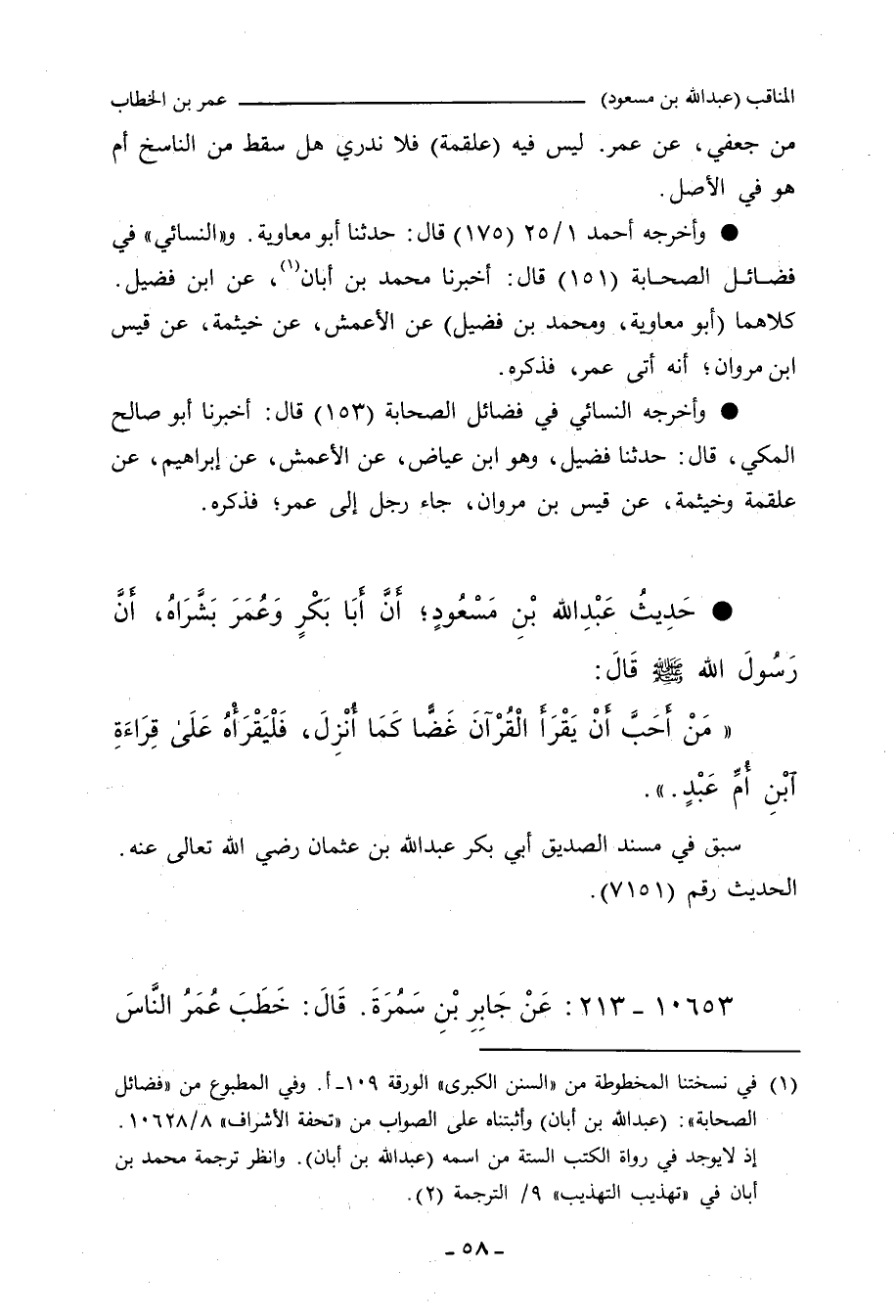 - وأخرجه النَّسَائِي، في (الكبرى) ٨٢٠٠ قال: أَخْبَرنا أبو صالح المَكِّي، قال: حدَّثنا فُضَيْل، وهو ابن عياض، عن الأَعْمَش، عن إبراهيم، عن علقمة، وخيثمة، عن قَيْس بن مَرْوَان؛ جَاءَ رَجُلٌ إِلَى عُمَرَ، فَقَالَ عُمَرُ: مِنْ أَيْنَ جِئْتَ؟ قَالَ: مِنَ الْعِرَاقِ، وَتَرَكْتُ بِهَا رَجُلاً يُمْلِي الْمُصْحَفَ عَنْ ظَهْرِ قَلْبٍ، قَالَ: وَمَنْ هُوَ؟ قَالَ: ابْنُ مَسْعُودٍ، قَالَ: مَا فِي النَّاسِ أَحَدٌ أَحَقُّ بِذَلِكَ مِنْهُ، ثُمَّ قَالَ: أُحَدِّثُكَ عَنْ ذَلِكَ؛