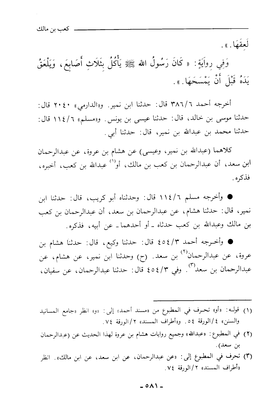 كلاهما (عَبْد الله بن نُمَيْر، وعِيسَى) عن هِشَام بن عُرْوَة، عن عَبْد الرَّحْمان بن سَعْد، أن عَبْد الرَّحْمان بن كَعْب بن مالك، أو عَبْد الله بن كَعْب أخبره، فذكره.