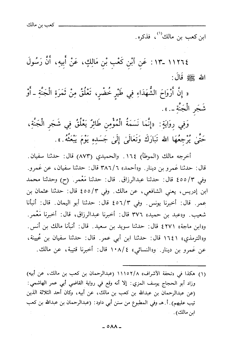 إِنَّ أَرْوَاحَ الشُّهَدَاءِ فِي طَيْرٍ خُضْرٍ، تَعْلُقُ مِنْ ثَمَرَةِ الْجَنَّةِ، أَوْ شَجَرِ الْجَنَّةِ.