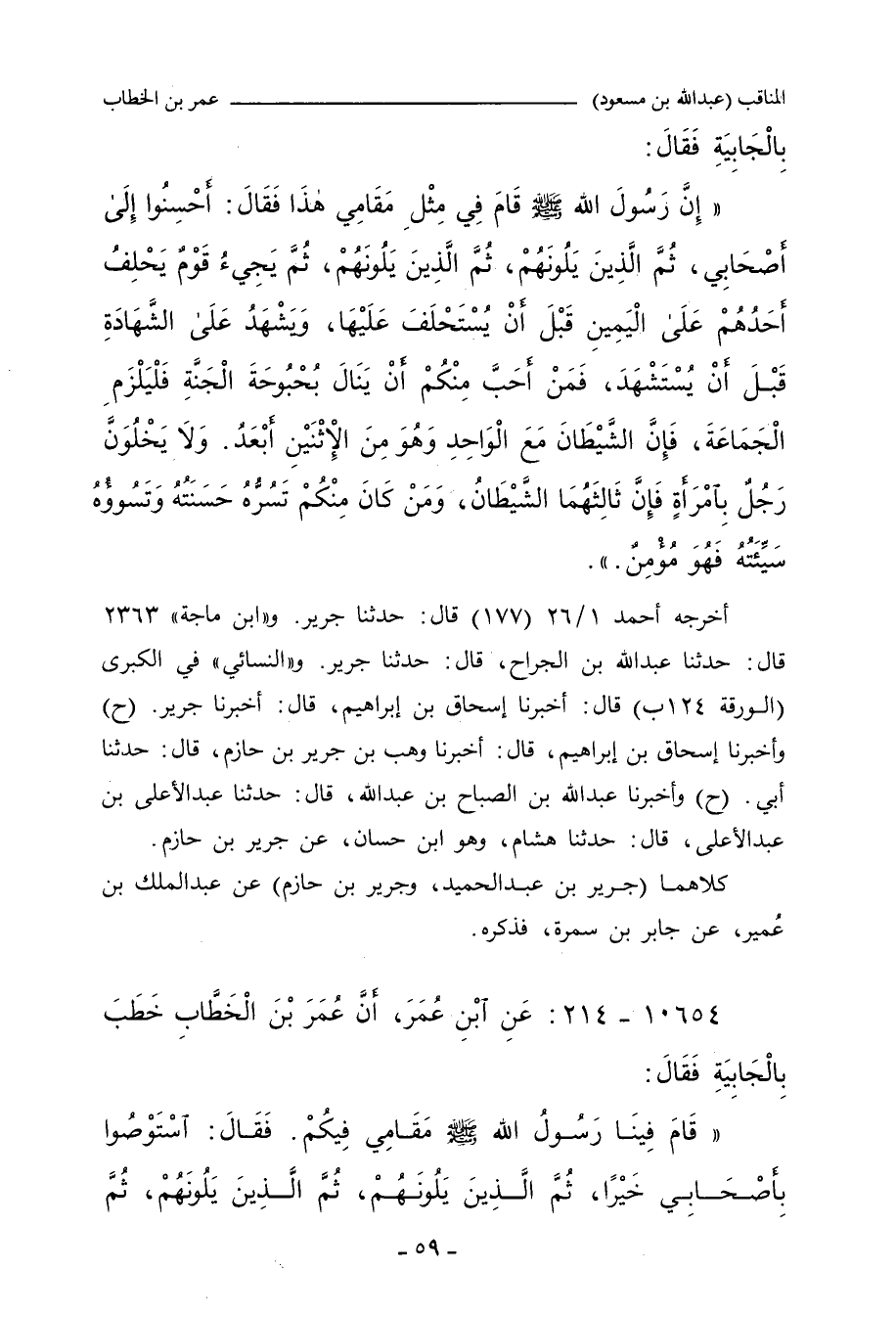 إِنَّ رَسُولَ اللهِ صلى الله عليه وسلم قَامَ فِي مِثْلِ مَقَامِي هَذَا، فَقَالَ: أَحْسِنُوا إِلَى أَصْحَابِي، ثُمَّ الَّذِينَ يَلُونَهُمْ، ثُمَّ الَّذِينَ يَلُونَهُمْ، ثُمَّ يَجِيءُ قَوْمٌ يَحْلِفُ أَحَدُهُمْ عَلَى الْيَمِينِ قَبْلَ أَنْ يُسْتَحْلَفَ عَلَيْهَا، وَيَشْهَدُ عَلَى الشَّهَادَةِ قَبْلَ أَنْ يُسْتَشْهَدَ، فَمَنْ أَحَبَّ مِنْكُمْ أَنْ يَنَالَ بُحْبُوحَةَ الْجَنَّةِ، فَلْيَلْزَمِ الْجَمَاعَةَ، فَإِنَّ الشَّيْطَانَ مَعَ الْوَاحِدِ، وَهُوَ مِنَ الاِثْنَيْنِ أَبْعَدُ، وَلَا يَخْلُوَنَّ رَجُلٌ بِامْرَأَةٍ، فَإِنَّ ثَالِثَهُمَا الشَّيْطَانُ، وَمَنْ كَانَ مِنْكُمْ تَسُرُّهُ حَسَنَتُهُ، وَتَسُوؤُهُ سَيِّئَتُهُ، فَهُوَ مُؤْمِنٌ.