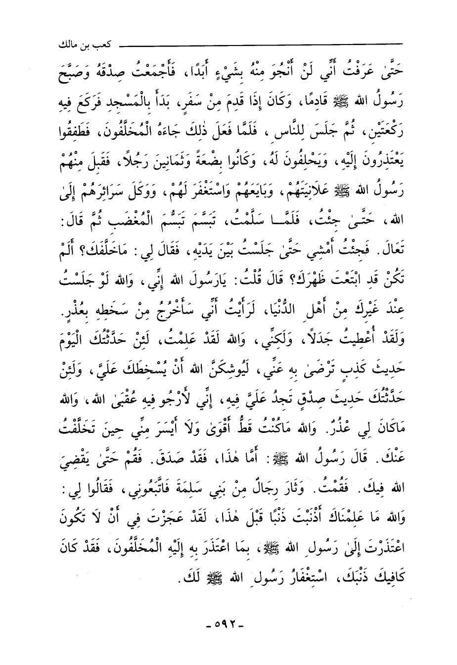 حَتَّى عَرَفْتُ أَنِّي لَنْ أَنْجُوَ مِنْهُ بِشَيْءٍ أَبَدًا، فَأَجْمَعْتُ صِدْقَهُ، وَصَبَّحَ رَسُولُ اللهِ صلى الله عليه وسلم قَادِمًا، وَكَانَ إِذَا قَدِمَ مِنْ سَفَرٍ، بَدَأَ بِالْمَسْجِدِ، فَرَكَعَ فِيهِ رَكْعَتَيْنِ، ثُمَّ جَلَسَ لِلنَّاسِ، فَلَمَّا فَعَلَ ذَلِكَ جَاءَهُ الْمُخَلَّفُونَ، فَطَفِقُوا يَعْتَذِرُونَ إِلَيْهِ، وَيَحْلِفُونَ لَهُ، وَكَانُوا بِضْعَةً وَثَمَانِينَ رَجُلاً، فَقَبِلَ مِنْهُمْ رَسُولُ اللهِ صلى الله عليه وسلم عَلَانِيَتَهُمْ، وَبَايَعَهُمْ وَاسْتَغْفَرَ لَهُمْ، وَوَكَلَ سَرَائِرَهُمْ إِلَى اللهِ، حَتَّى جِئْتُ، فَلَمَّا سَلَّمْتُ، تَبَسَّمَ تَبَسُّمَ الْمُغْضَبِ، ثُمَّ قَالَ: تَعَالَ، فَجِئْتُ أَمْشِي حَتَّى جَلَسْتُ بَيْنَ يَدَيْهِ، فَقَالَ لِي: مَا خَلَّفَكَ؟ أَلَمْ تَكُنْ قَدِ ابْتَعْتَ ظَهْرَكَ؟ قَالَ: قُلْتُ: يَا رَسُولَ اللهِ، إِنِّي، وَاللهِ لَوْ جَلَسْتُ عِنْدَ غَيْرِكَ مِنْ أَهْلِ الدُّنْيَا،