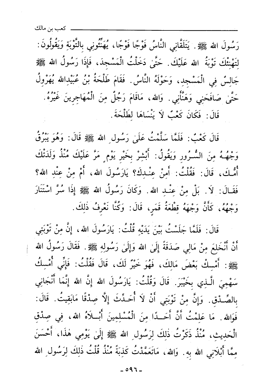 وَهَنَّأَنِي، وَاللهِ مَا قَامَ رَجُلٌ مِنَ الْمُهَاجِرِينَ غَيْرُهُ، قَالَ: فَكَانَ كَعْبٌ لَا يَنْسَاهَا لِطَلْحَةَ، قَالَ كَعْبٌ: فَلَمَّا سَلَّمْتُ عَلَى رَسُولِ اللهِ صلى الله عليه وسلم، قَالَ: وَهُوَ يَبْرُقُ وَجْهُهُ مِنَ السُّرُورِ، وَيَقُولُ: أَبْشِرْ بِخَيْرِ يَوْمٍ مَرَّ عَلَيْكَ مُنْذُ وَلَدَتْكَ أُمُّكَ، قَالَ: فَقُلْتُ: أَمِنْ عِنْدِكَ يَا رَسُولَ اللهِ، أَمْ مِنْ عِنْدِ اللهِ؟ فَقَالَ: لَا، بَلْ مِنْ عِنْدِ اللهِ، وَكَانَ رَسُولُ اللهِ صلى الله عليه وسلم إِذَا سُرَّ اسْتَنَارَ وَجْهُهُ، كَأَنَّ وَجْهَهُ قِطْعَةُ قَمَرٍ، قَالَ: وَكُنَّا نَعْرِفُ ذَلِكَ، قَالَ: فَلَمَّا جَلَسْتُ بَيْنَ يَدَيْهِ، قُلْتُ: يَا رَسُولَ اللهِ، إِنَّ مِنْ تَوْبَتِي أَنْ أَنْخَلِعَ مِنْ مَا لِي صَدَقَةً إِلَى اللهِ، وَإِلَى رَسُولِهِ صلى الله عليه وسلم، فَقَالَ رَسُولُ اللهِ صلى الله عليه وسلم: أَمْسِكْ بَعْضَ مَالِكَ، فَهُوَ خَيْرٌ لَكَ، قَالَ: فَقُلْتُ: فَإِنِّي أُمْسِكُ سَهْمِيَ الَّذِي بِخَيْبَرَ، قَالَ: وَقُلْتُ: يَا رَسُولَ اللهِ، إِنَّ اللهَ إِنَّمَا أَنْجَانِي بِالصِّدْقِ، وَإِنَّ مِنْ تَوْبَتِي أَنْ لَا أُحَدِّثَ إِلَاّ صِدْقًا مَا بَقِيتُ، قَالَ: فَوَاللهِ مَا عَلِمْتُ أَنَّ أَحَدًا مِنَ الْمُسْلِمِينَ أَبْلَاهُ اللهُ، فِي صِدْقِ الْحَدِيثِ، مُنْذُ ذَكَرْتُ ذَلِكَ لِرَسُولِ اللهِ صلى الله عليه وسلم إِلَى يَوْمِي هَذَا، أَحْسَنَ مِمَّا أَبْلَانِي اللهُ بِهِ، وَاللهِ، مَا تَعَمَّدْتُ كَذْبَةً مُنْذُ قُلْتُ ذَلِكَ لِرَسُولِ اللهِ
