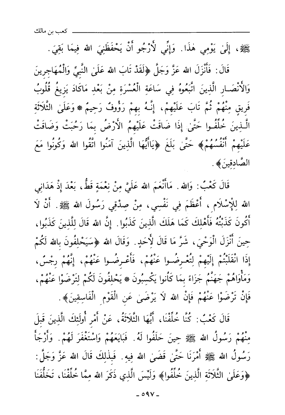 وَالأَنْصَارِ الَّذِينَ اتَّبَعُوهُ فِي سَاعَةِ الْعُسْرَةِ مِنْ بَعْدِ مَا كَادَ يَزِيغُ قُلُوبُ فَرِيقٍ مِنْهُمْ ثُمَّ تَابَ عَلَيْهِمْ إِنَّهُ بِهِمْ رَؤُوفٌ رَحِيمٌ. وَعَلَى الثَّلَاثَةِ الَّذِينَ خُلِّفُوا حَتَّى إِذَا ضَاقَتْ عَلَيْهِمُ الأَرْضُ بِمَا رَحُبَتْ وَضَاقَتْ عَلَيْهِمْ أَنْفُسُهُمْ? حَتَّى بَلَغَ: ?يَا أَيُّهَا الَّذِينَ آمَنُوا اتَّقُوا اللهَ وَكُونُوا مَعَ الصَّادِقِينَ? قَالَ كَعْبٌ: وَاللهِ، مَا أَنْعَمَ اللهُ عَلَيَّ مِنْ نِعْمَةٍ قَطُّ، بَعْدَ إِذْ هَدَانِي اللهُ لِلإِسْلَامِ، أَعْظَمَ فِي نَفْسِي مِنْ صِدْقِي رَسُولَ اللهِ صلى الله عليه وسلم، أَنْ لَا أَكُونَ كَذَبْتُهُ، فَأَهْلِكَ كَمَا هَلَكَ الَّذِينَ كَذَبُوا، إِنَّ اللهَ قَالَ لِلَّذِينَ كَذَبُوا، حِينَ أَنْزَلَ الْوَحْيَ، شَرَّ مَا قَالَ لأَحَدٍ، وَقَالَ اللهُ: ?سَيَحْلِفُونَ بِاللهِ لَكُمْ إِذَا انْقَلَبْتُمْ إِلَيْهِمْ لِتُعْرِضُوا عَنْهُمْ فَأَعْرِضُوا عَنْهُمْ إِنَّهُمْ رِجْسٌ وَمَأْوَاهُمْ جَهَنَّمُ جَزَاءً بِمَا كَانُوا يَكْسِبُونَ. يَحْلِفُونَ لَكُمْ لِتَرْضَوْا عَنْهُمْ فَإِنْ تَرْضَوْا عَنْهُمْ فَإِنَّ اللهَ لَا يَرْضَى عَنِ الْقَوْمِ الْفَاسِقِينَ? قَالَ كَعْبٌ: كُنَّا خُلِّفْنَا أَيُّهَا الثَّلَاثَةُ عَنْ أَمْرِ أُولَئِكَ الَّذِينَ قَبِلَ مِنْهُمْ رَسُولُ اللهِ صلى الله عليه وسلم، حِينَ حَلَفُوا لَهُ، فَبَايَعَهُمْ وَاسْتَغْفَرَ لَهُمْ، وَأَرْجَأَ رَسُولُ اللهِ صلى الله عليه وسلم أَمْرَنَا، حَتَّى قَضَى اللهُ فِيهِ، فَبِذَلِكَ قَالَ اللهُ، عَزَّ وَجَلَّ: ?وَعَلَى الثَّلَاثَةِ الَّذِينَ خُلِّفُوا? وَلَيْسَ الَّذِي ذَكَرَ اللهُ مِمَّا خُلِّفْنَا، تَخَلُّفَنَا