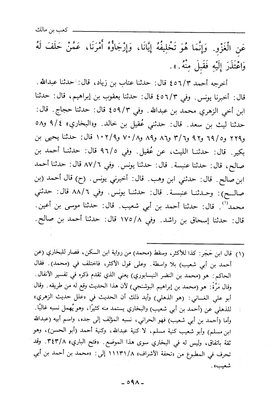 - وفي رواية: سَمِعْتُ أَبِي كَعْبَ بْنَ مَالِكٍ، وَهْوَ أَحَدُ الثَّلَاثَةِ الَّذِينَ تِيبَ عَلَيْهِمْ، أَنَّهُ لَمْ يَتَخَلَّفْ عَنْ رَسُولِ اللهِ صلى الله عليه وسلم فِي غَزْوَةٍ غَزَاهَا قَطُّ، غَيْرَ غَزْوَتَيْنِ، غَزْوَةِ الْعُسْرَةِ، وَغَزْوَةِ بَدْرٍ، قَالَ: فَأَجْمَعْتُ صِدْقَ رَسُولِ اللهِ صلى الله عليه وسلم ضُحًى، وَكَانَ قَلَّمَا يَقْدَمُ مِنْ سَفَرٍ سَافَرَهُ إِلَاّ ضُحًى، وَكَانَ يَبْدَأُ بِالْمَسْجِدِ، فَيَرْكَعُ رَكْعَتَيْنِ، وَنَهَى النَّبِيُّ صلى الله عليه وسلم عَنْ كَلَامِي وَكَلَامِ صَاحِبَيَّ، وَلَمْ يَنْهَ عَنْ كَلَامِ أَحَدٍ مِنَ الْمُتَخَلِّفِينَ غَيْرِنَا، فَاجْتَنَبَ النَّاسُ كَلَامَنَا، فَلَبِثْتُ كَذَلِكَ حَتَّى طَالَ عَلَيَّ الأَمْرُ، وَمَا مِنْ شَيْءٍ أَهَمُّ إِلَيَّ مِنْ أَنْ أَمُوتَ، فَلَا يُصَلِّي عَلَيَّ النَّبِيُّ صلى الله عليه وسلم، أَوْ يَمُوتَ رَسُولُ اللهِ صلى الله عليه وسلم، فَأَكُونَ مِنَ النَّاسِ بِتِلْكَ الْمَنْزِلَةِ، فَلَا يُكَلِّمُنِي أَحَدٌ مِنْهُمْ، وَلَا يُصَلِّي عَلَيَّ، فَأَنْزَلَ اللهُ تَوْبَتَنَا عَلَى نَبِيِّهِ صلى الله عليه وسلم، حِينَ بَقِيَ الثُّلُثُ الآخِرُ مِنَ اللَّيْلِ، وَرَسُولُ اللهِ صلى الله عليه وسلم عِنْدَ أُمِّ سَلَمَةَ، وَكَانَتْ أُمُّ سَلَمَةَ مُحْسِنَةً فِي شَأْنِي، مَعْنِيَّةً فِي أَمْرِي، فَقَالَ رَسُولُ اللهِ صلى الله عليه وسلم: يَا أُمَّ سَلَمَةَ، تِيبَ عَلَى كَعْبٍ، قَالَتْ: أَفَلَا أُرْسِلُ إِلَيْهِ فَأُبَشِّرَهُ؟ قَالَ: إِذًا يَحْطِمَكُمُ النَّاسُ، فَيَمْنَعُونَكُمُ النَّوْمَ سَائِرَ اللَّيْلَةِ، حَتَّى إِذَا صَلَّى رَسُولُ اللهِ صلى الله عليه وسلم صَلَاةَ الْفَجْرِ، آذَنَ بِتَوْبَةِ اللهِ عَلَيْنَا، وَكَانَ إِذَا اسْتَبْشَرَ اسْتَنَارَ وَجْهُهُ، حَتَّى