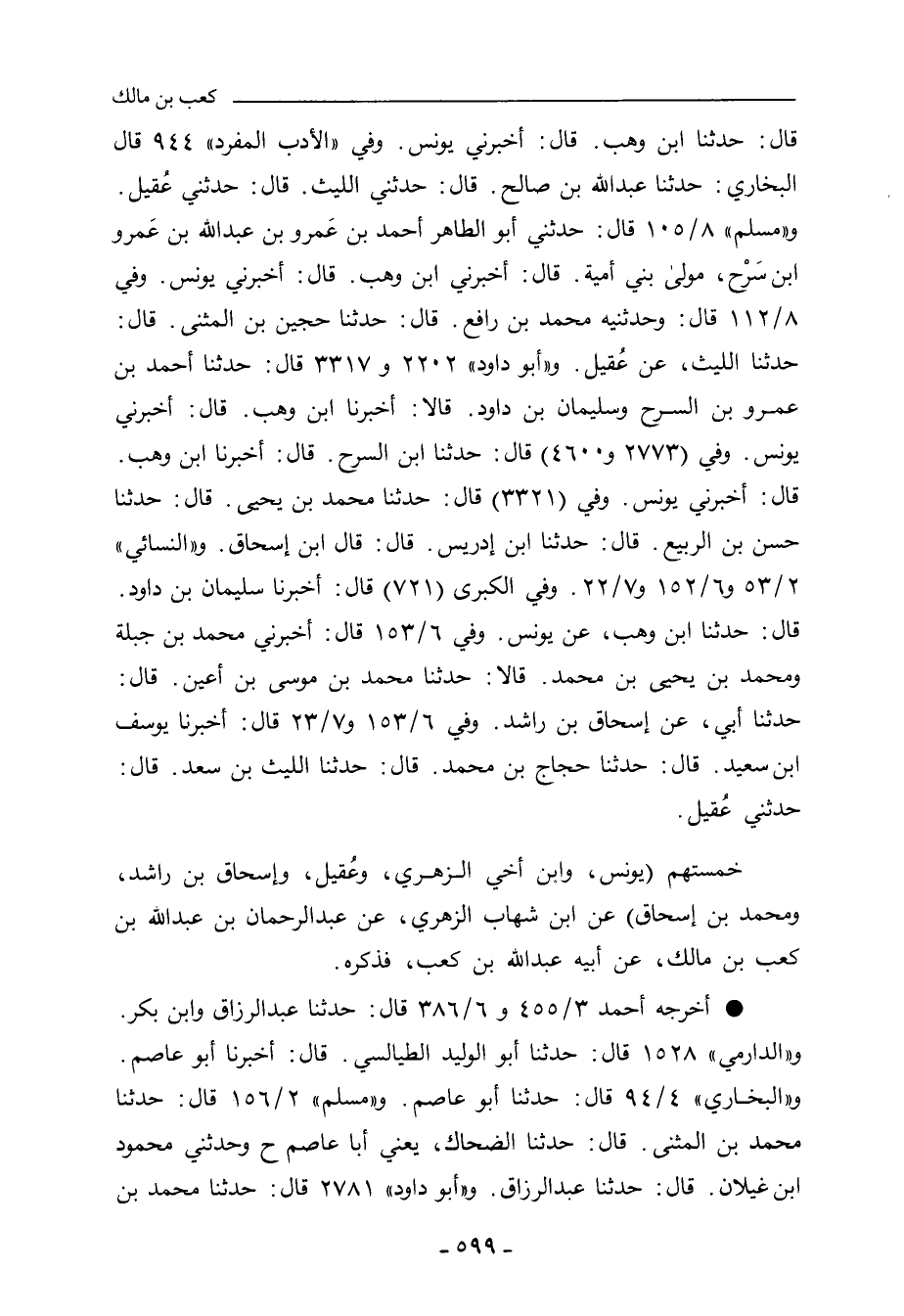 خمستهم (يُونُس، وابن أخي الزُّهْرِي، وعُقَيْل، وإِسْحاق ابن راشد، ومُحَمد بن إِسْحاق) عن ابن شِهَاب الزُّهْرِي، قال: فأخبرني عَبْد الرَّحْمان بن عَبْد الله بن كَعْب بن مالك، أن عَبْد الله بن كَعْب بن مالك، فذكره.