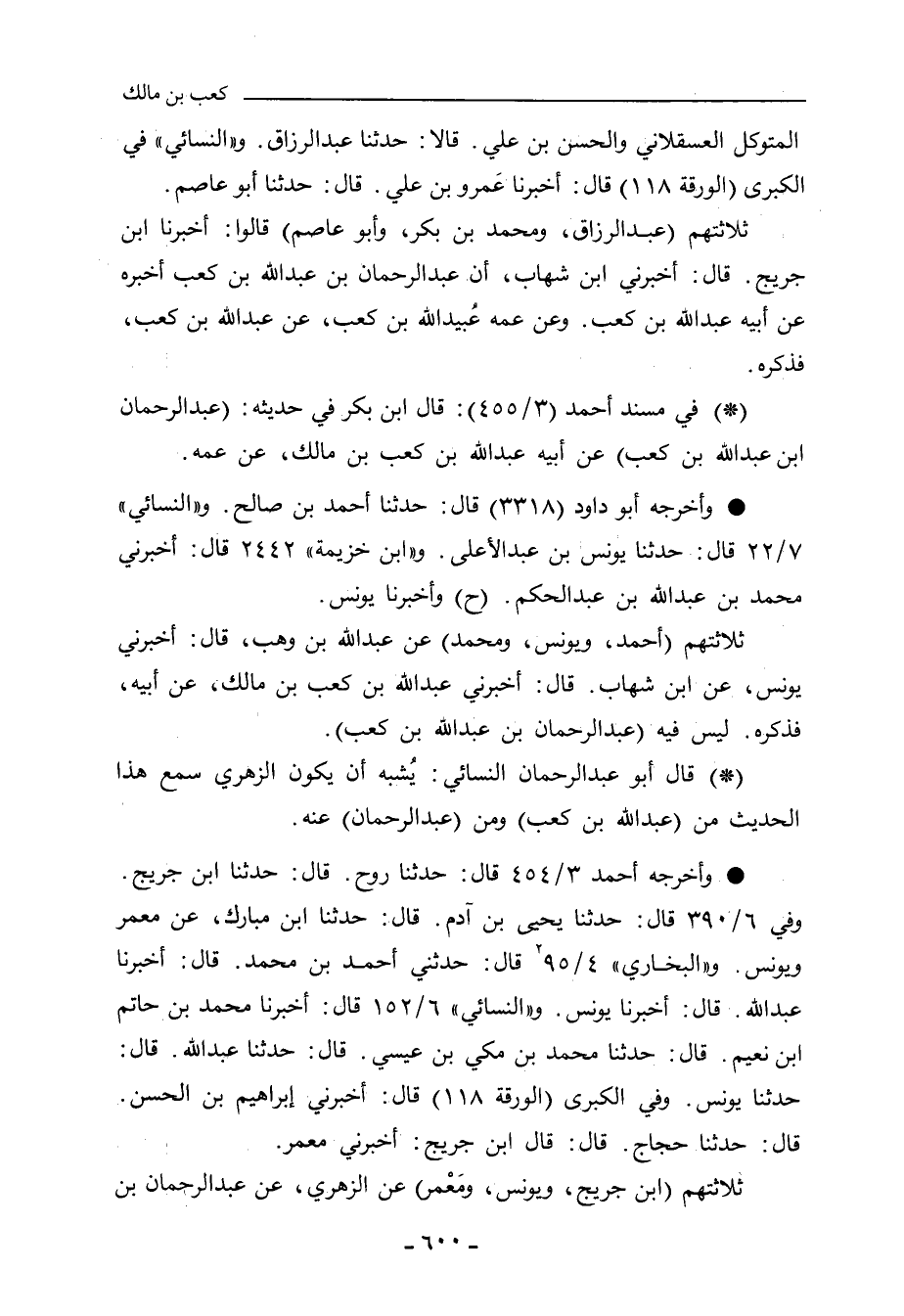 - في مسند أحمد (١٥٨٦٧): وقال ابن بَكْر في حديثه: عَبْد الرَّحْمان بن عَبْد الله بن كَعْب، عن أبيه عَبْد الله بن كَعْب بن مالك، عن عَمِّه.