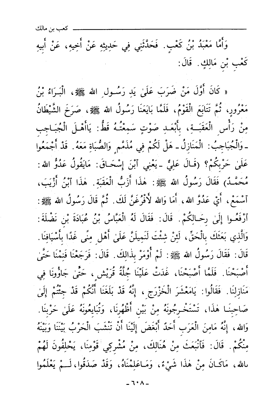 كَانَ أَوَّلَ مَنْ ضَرَبَ عَلَى يَدِ رَسُولِ اللهِ صلى الله عليه وسلم الْبَرَاءُ بْنُ مَعْرُورٍ، ثُمَّ تَتَابَعَ الْقَوْمُ، فَلَمَّا بَايَعْنَا رَسُولَ اللهِ صلى الله عليه وسلم، صَرَخَ الشَّيْطَانُ مِنْ رَأْسِ الْعَقَبَةِ، بِأَبْعَدِ صَوْتٍ سَمِعْتُهُ قَطُّ: يَا أَهْلَ الْجُبَاجِبِ - وَالْجُبَاجِبُ: الْمَنَازِلُ - هَلْ لَكُمْ فِي مُذَمَّمٍ وَالصُّبَاءُ مَعَهُ، قَدْ أَجْمَعُوا عَلَى حَرْبِكُمْ (قَالَ عَلِيٌّ، يَعْنِي ابْنَ إِسْحَاقَ: مَا يَقُولُ عَدُوُّ اللهِ مُحَمَّدٌ) فَقَالَ رَسُولُ اللهِ صلى الله عليه وسلم: هَذَا أَذَبُّ الْعَقَبَةِ، هَذَا ابْنُ أَذْيَبَ، اسْمَعْ، أَيْ عَدُوَّ اللهِ، أَمَا وَاللهِ لأَفْرُغَنَّ لَكَ، ثُمَّ قَالَ رَسُولُ اللهِ صلى الله عليه وسلم: ارْفَعُوا إِلَى رِحَالِكُمْ، قَالَ: فَقَالَ لَهُ الْعَبَّاسُ بْنُ عُبَادَةَ بْنِ نَضْلَةَ: وَالَّذِي بَعَثَكَ بِالْحَقِّ، لَئِنْ شِئْتَ لَنَمِيلَنَّ عَلَى أَهْلِ مِنًي غَدًا بِأَسْيَافِنَا، قَالَ: فَقَالَ رَسُولُ اللهِ صلى الله عليه وسلم: لَمْ أُومَرْ بِذَلِكَ، قَالَ: فَرَجَعْنَا، فَنِمْنَا حَتَّى أَصْبَحْنَا، فَلَمَّا أَصْبَحْنَا غَدَتْ عَلَيْنَا جُلَّةُ قُرَيْشٍ، حَتَّى جَاؤُونَا فِي مَنَازِلِنَا، فَقَالُوا: يَا مَعْشَرَ الْخَزْرَجِ، إِنَّهُ قَدْ بَلَغَنَا أَنَّكُمْ قَدْ جِئْتُمْ إِلَى