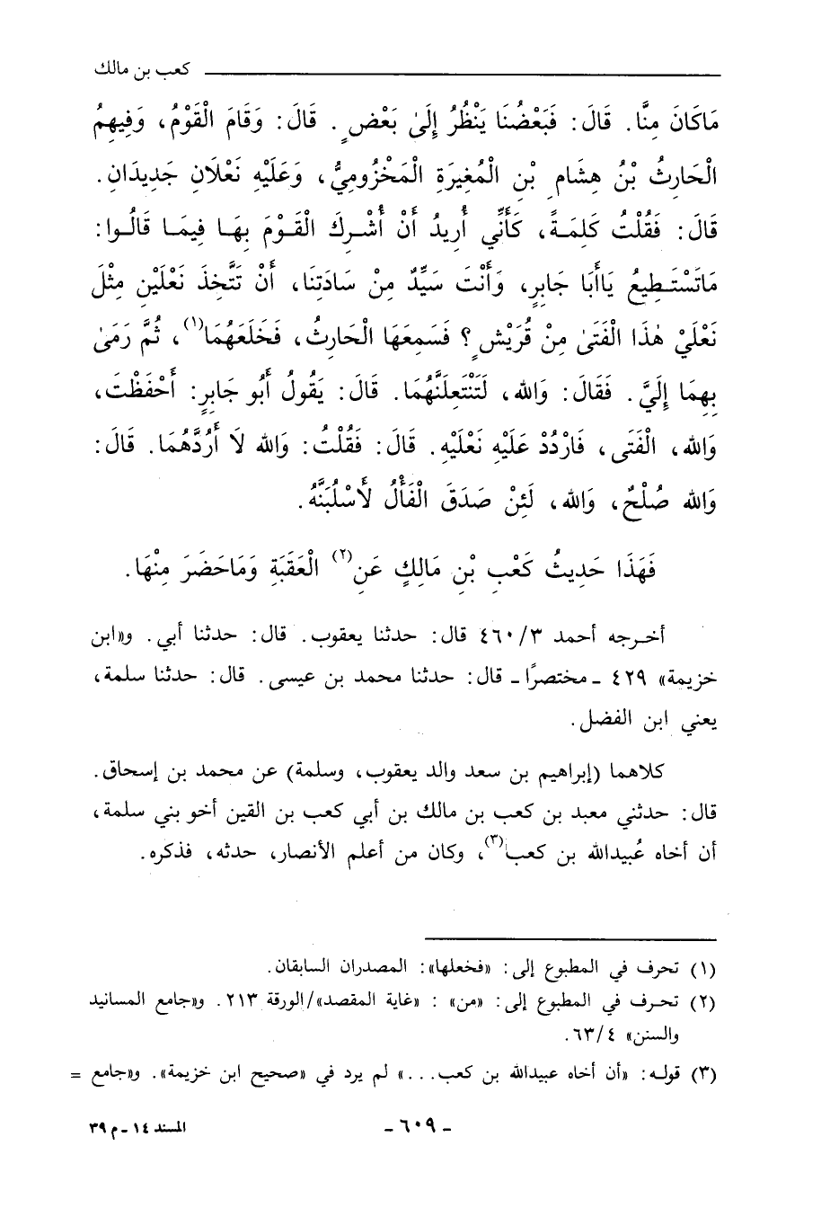 - وأخرجه ابن خُزَيْمة (٤٢٩) قال: حدَّثناه مُحَمد بن عِيسَى، حدَّثنا سَلَمَة، يَعْنِي ابن الفَضْل، حدَّثنا مُحَمد بن إِسْحَاق، قال: وحدَّثني مَعْبَد بن كَعْب بن مالك، وكان من أعلم الأَنْصَار، حدَّثه، أن أباه كَعْبًا حدَّثه، وخبر كَعْب بن مالك في خروج الأَنْصَار من المَدِينَة إلى مكَّة، في بيعة العَقَبَة، وذكر في الخبر، أَنَّ البَرَاءَ بْنَ مَعْرُورٍ قَالَ لِلنَّبِيِّ صلى الله عليه وسلم: