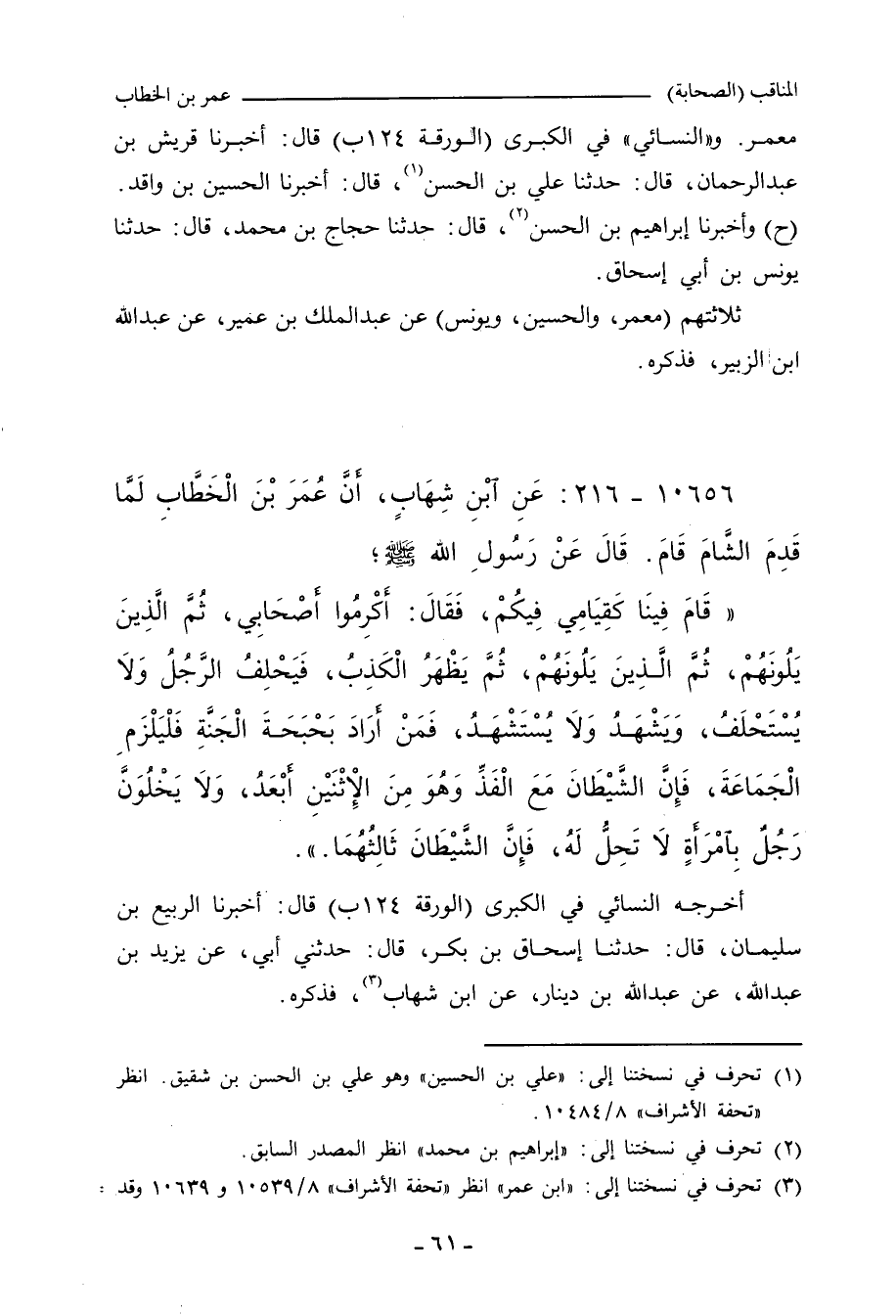 إِنَّ رَسُولَ اللهِ صلى الله عليه وسلم قَامَ فِينَا كَقِيَامِي فِيكُمْ، فَقَالَ: أَكْرِمُوا أَصْحَابِي، ثُمَّ الَّذِينَ يَلُونَهُمْ، ثُمَّ الَّذِينَ يَلُونَهُمْ، ثُمَّ يَظْهَرُ الْكَذِبُ، فَيَحْلِفُ الرَّجُلُ وَلَا يُسْتَحْلَفُ، وَيَشْهَدُ وَلَا يُسْتَشْهَدُ، فَمَنْ أَرَادَ بَحْبَحَةَ الْجَنَّةِ، فَلْيَلْزَم الْجَمَاعَةَ، فَإِنَّ الشَّيْطَانَ مَعَ الْفَذِّ، وَهُوَ مِنَ الاِثْنَيْنِ أَبْعَدُ، وَلَا يَخْلُوَنَّ رَجُلٌ بِامْرَأَةٍ لَا تَحِلُّ لَهُ، فَإِنَّ الشَّيْطَانَ ثَالِثُهُمَا.