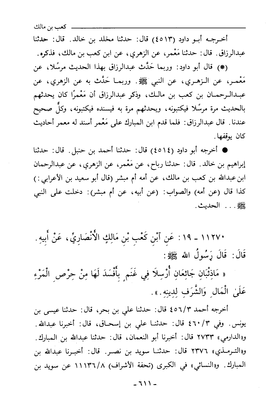 - قال أبو داود: وربما حَدَّث عَبْد الرَّزَّاق بهذا الحديث مُرْسَلاً، عن مَعْمَر، عن الزُّهْرِي، عن النَّبِيِّ صلى الله عليه وسلم، وربما حَدَّث به عن الزُّهْرِي، عن عَبْد الرَّحْمان بن كَعْب بن مالك، وذكر عَبْد الرَّزَّاق أن مَعْمَرًا كان يُحدِّثهم بالحديث مَرَّة مُرْسَلاً، فيكتبونه، ويحدِّثهم مَرَّةً به فيُسْنِدُهُ، فيكتبونه، وكلٌّ صحيحٌ عندنا، قال عَبْد الرَّزَّاق: فلما قَدِمَ ابن المُبَارك على مَعْمَر أسند له مَعْمَر أحاديث كان يُوقِفُها.