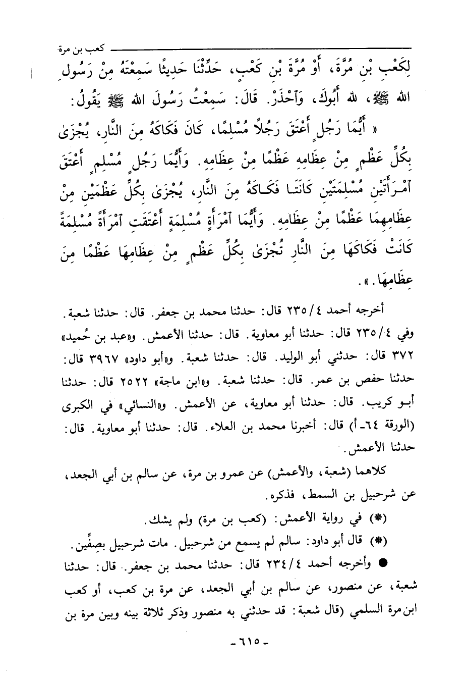 ثلاثتهم (أحمد، وأبو كُرَيْب، ومُحَمد بن العَلَاء) قالوا: حدَّثنا أبو مُعَاوِية، حدَّثنا الأَعْمَش، عن عَمْرو بن مُرَّة، عن سالم بن أَبي الجَعْد، عَنْ شُرَحْبِيلَ بْنِ السِّمْطِ، قَالَ: قُلْتُ لِكَعْبٍ: يَا كَعْبَ بْنَ مُرَّةَ، حَدِّثْنَا عَنْ رَسُولِ اللهِ صلى الله عليه وسلم وَاحْذَرْ، قَالَ: سَمِعْتُ رَسُولَ اللهِ صلى الله عليه وسلم يَقُولُ: