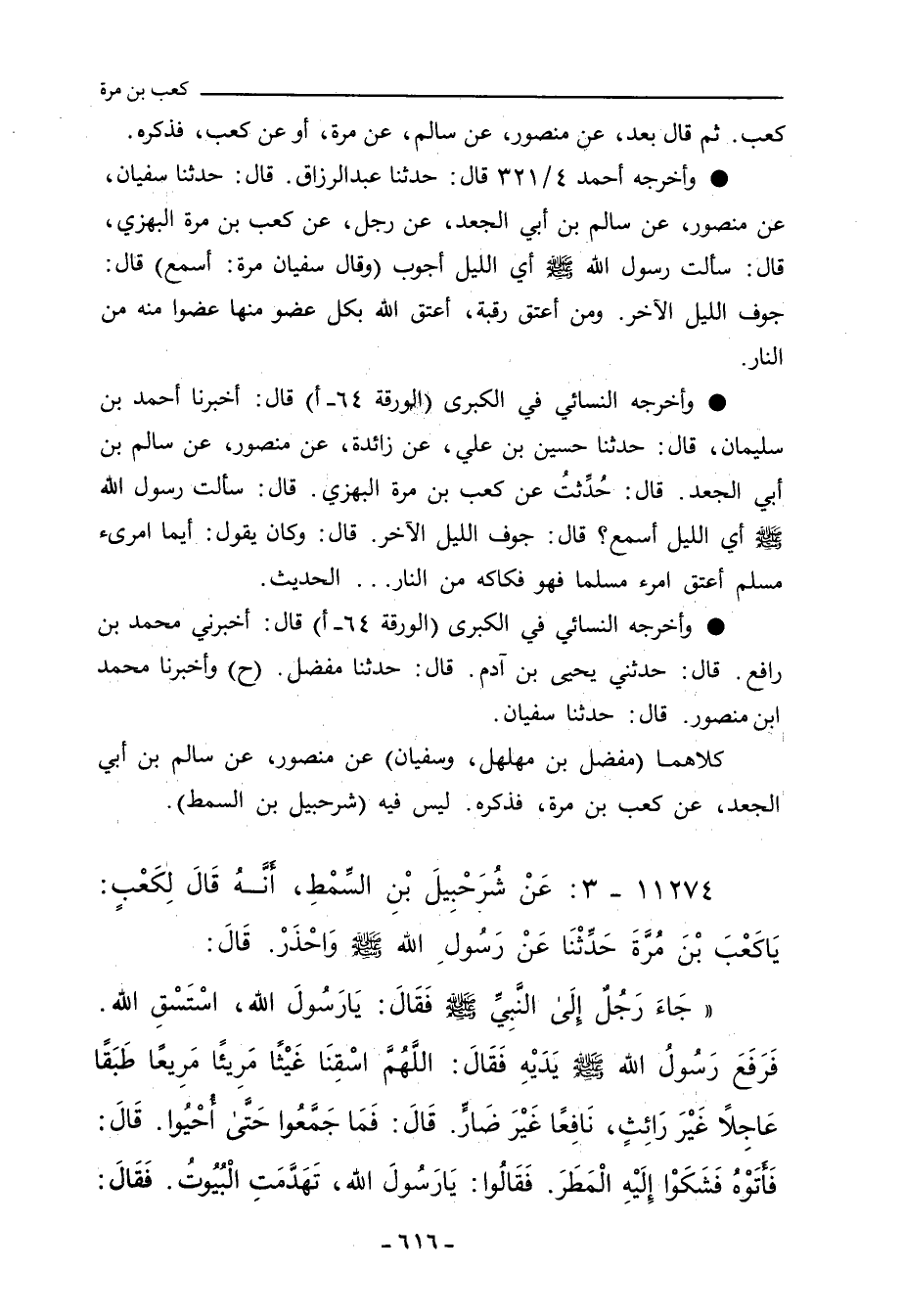 ١١٢٧٤ - عَنْ شُرَحْبِيلَ بْنِ السِّمْطِ، أَنَّهُ قَالَ لِكَعْبٍ: يَا كَعْبُ بْنَ مُرَّةَ، حَدِّثْنَا عَنْ رَسُولِ اللهِ صلى الله عليه وسلم وَاحْذَرْ، قَالَ: