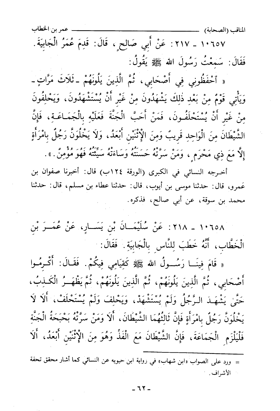 ١٠٦٥٨ - عَنْ سُلَيْمَانَ بْنِ يَسَارٍ، عَنْ عُمَرَ بْنِ الْخَطَّابِ، أَنَّهُ خَطَبَ لِلنَّاسِ بِالْجَابِيةِ، فَقَالَ: