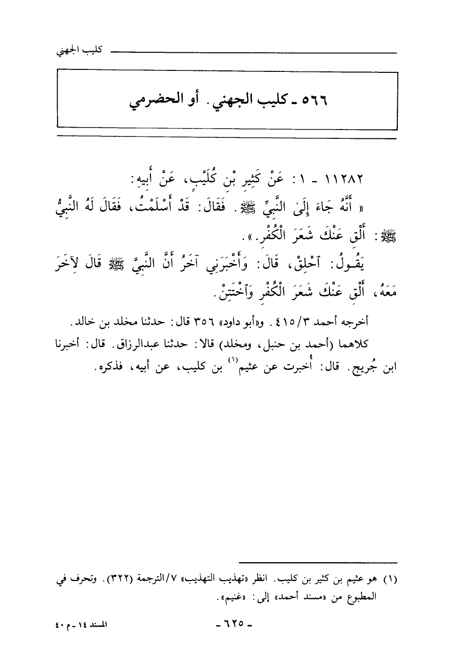 كلاهما (أحمد بن حنبل , ومخلد) قالا: حدثنا عبد الرزاق. قال: أَخْبَرنا ابن جريج. قال: أخبرت عن عثيم بن كليب , عن أبيه , فذكره.