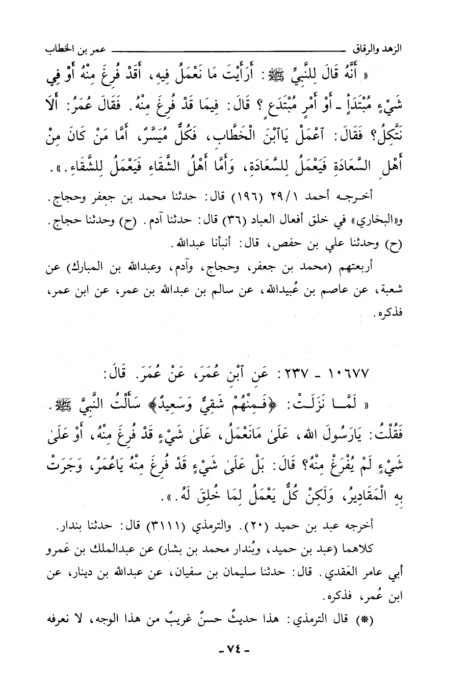 أَنَّهُ قَالَ لِلنَّبِيِّ صلى الله عليه وسلم: أَرَأَيْتَ مَا نَعْمَلُ فِيهِ، أَقَدْ فُرِغَ مِنْهُ، أَوْ فِي شَيْءٍ مُبْتَدَإٍ، أَوْ أَمْرٍ مُبْتَدَعٍ؟ قَالَ: فِيمَا قَدْ فُرِغَ مِنْهُ، فَقَالَ عُمَرُ: أَلَا نَتَّكِلُ؟ فَقَالَ: اعْمَلْ يَا ابْنَ الْخَطَّابِ، فَكُلٌّ مُيَسَّر، أَمَّا مَنْ كَانَ مِنْ أَهْلِ السَّعَادَةِ، فَيَعْمَلُ لِلسَّعَادَةِ، وَأَمَّا أَهْلُ الشَّقَاءِ، فَيَعْمَلُ لِلشَّقَاءِ.