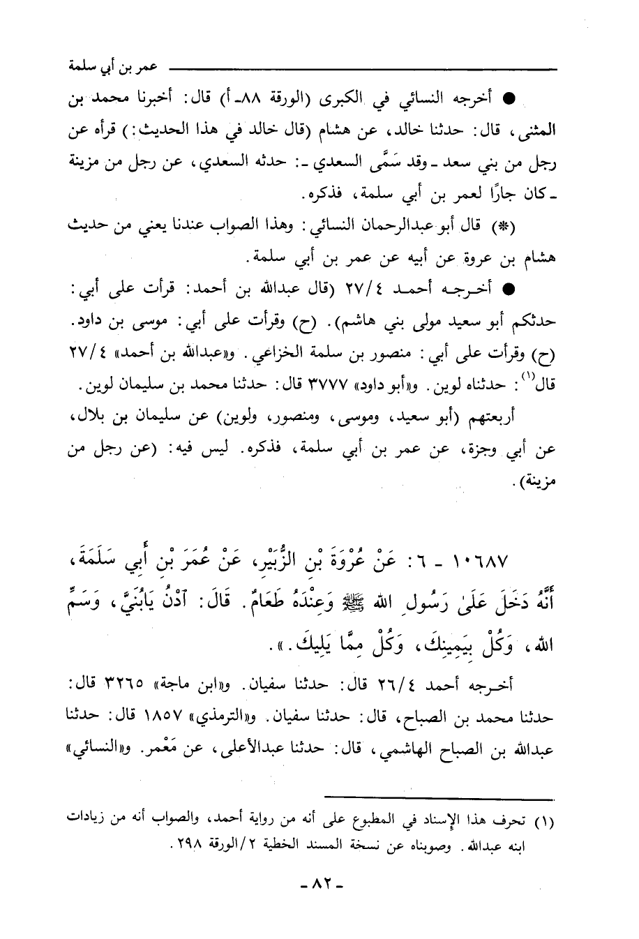 - أخرجه النَّسَائِي، في "الكبرى"٦٧٢٣ قال: أَخْبَرنا مُحَمد بن المُثَنَّى، قال: حدَّثنا خالد، عن هِشَام (قال خالد في هذا الحديث:) قرأه عن رجلٍ من بني سَعْد، وقد سَمَّى السَّعْدِي: حدَّثه السَّعْدِي، عن رجلٍ من مُزَيْنَة، كان جارًا لعُمَر بن أَبي سَلَمَة، فحدَّث المُزَنِي، أن عُمَر ذكر؛