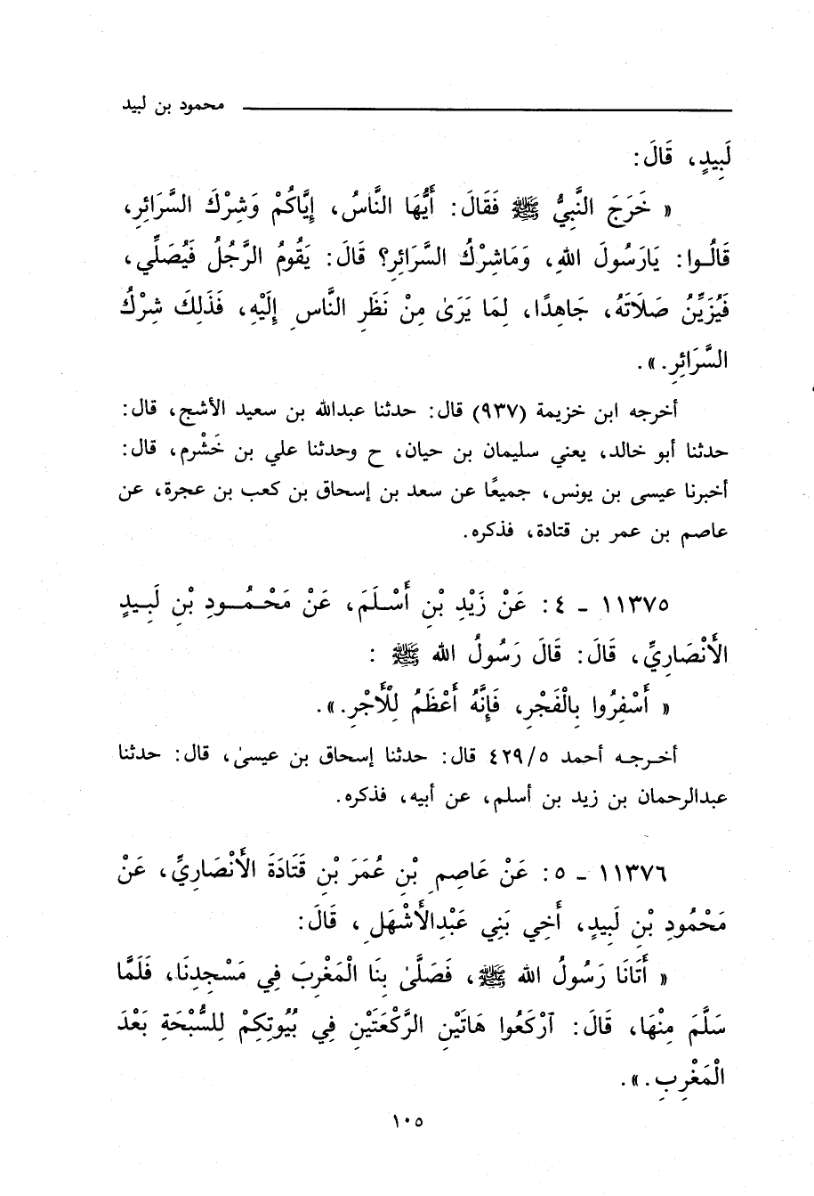 ١١٣٧٥ - عَنْ زَيْدِ بْنِ أَسْلَمَ، عَنْ مَحْمُودِ بْنِ لَبِيدٍ الأَنْصَارِيِّ، قَالَ: قَالَ رَسُولُ اللهِ صلى الله عليه وسلم: