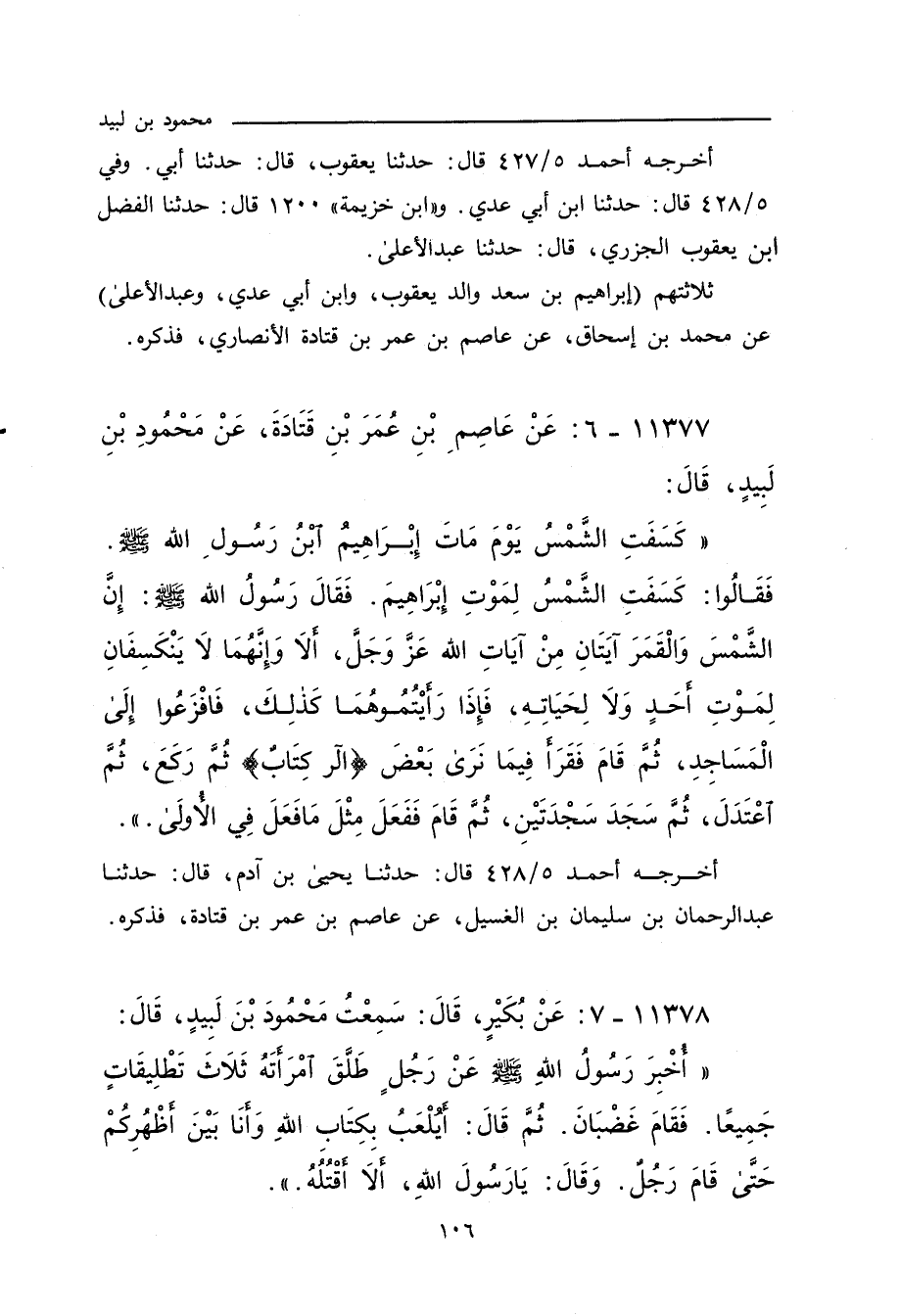 ١١٣٧٧ - عَنْ عَاصِمِ بْنِ عُمَرَ بْنِ قَتَادَةَ، عَنْ مَحْمُودِ بْنِ لَبِيدٍ، قَالَ: